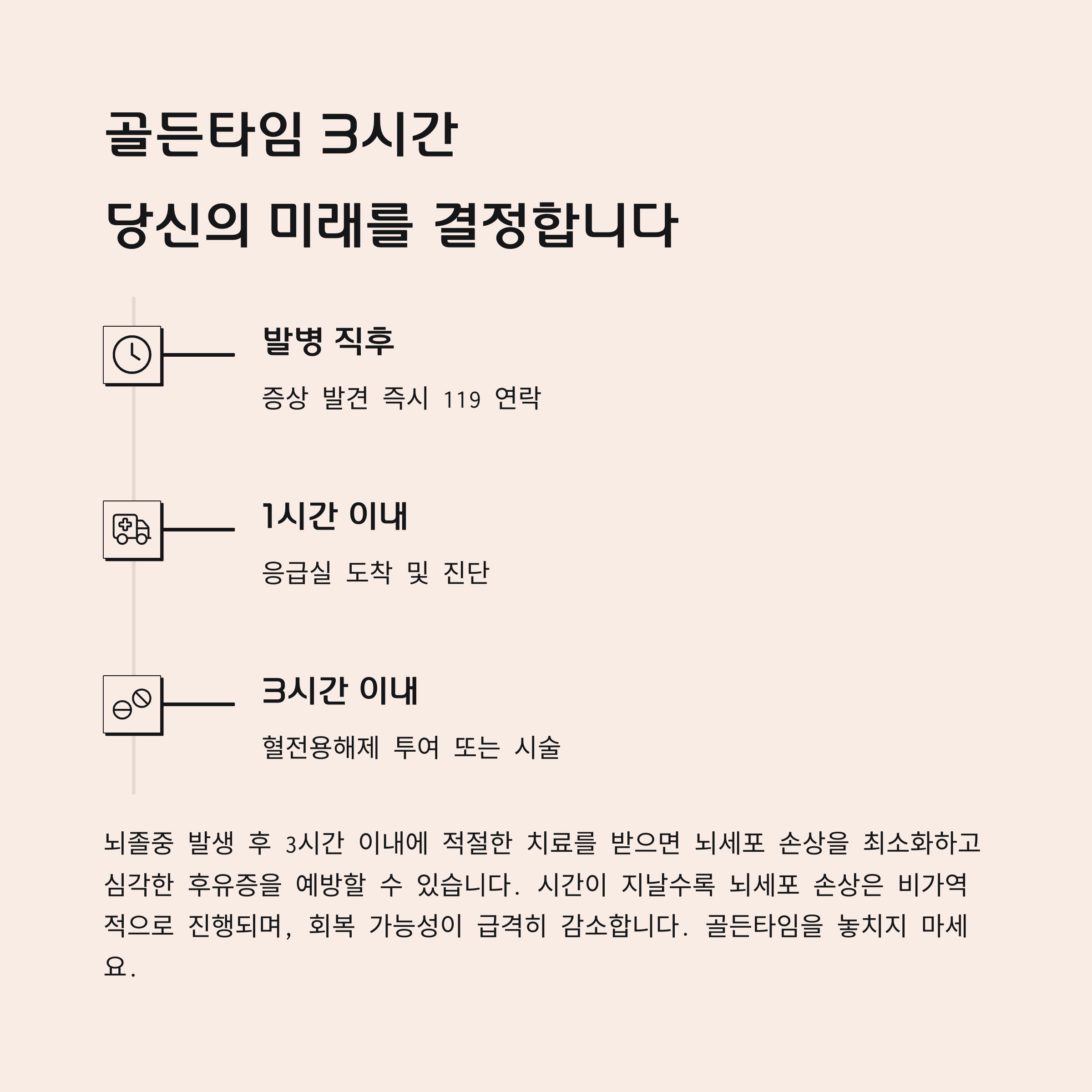 뇌졸중은 언제 어디서나 갑자기 발생할 수 있는 위험한 질환입니다. 초기 증상을 빠르게 인지하고 골든타임 내에 적절한 대처를 한다면, 뇌 신경마비와 같은 후유증을 최소화할 수 있습니다. 평소 건강 관리와 예방 습관을 철저히 지키고, 정기 검진을 통해 위험 요소를 사전에 파악하는 것이 중요합니다. 특히 가족 중에 뇌졸중 위험 인자가 있는 경우, 응급 대처법을 미리 숙지해 두는 것도 필요합니다. 건강을 지키기 위해 작은 습관부터 바꿔 나간다면 큰 위험을 예방할 수 있습니다. 여러분의 건강을 응원합니다!