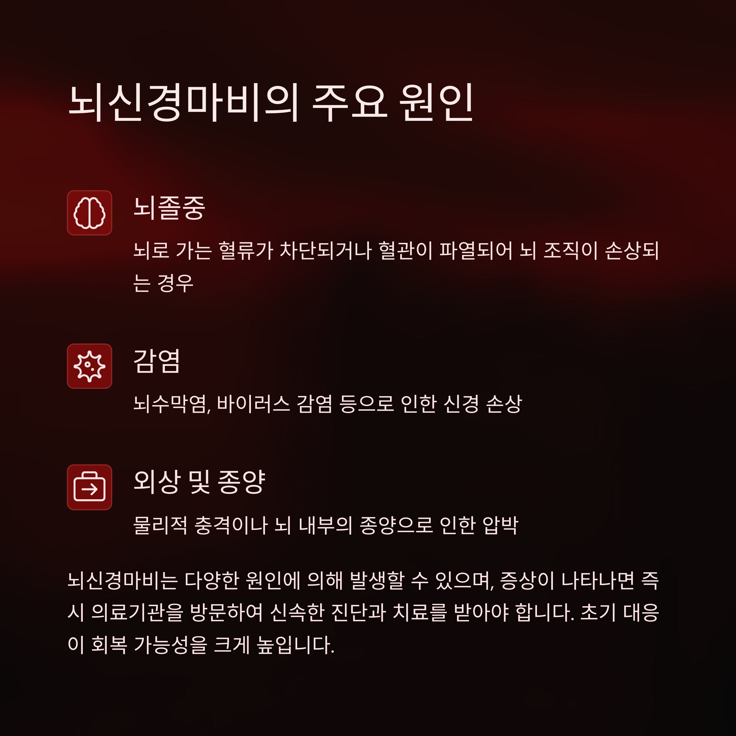 | 외상 | 두부 외상으로 인해 뇌신경이 손상됨 |