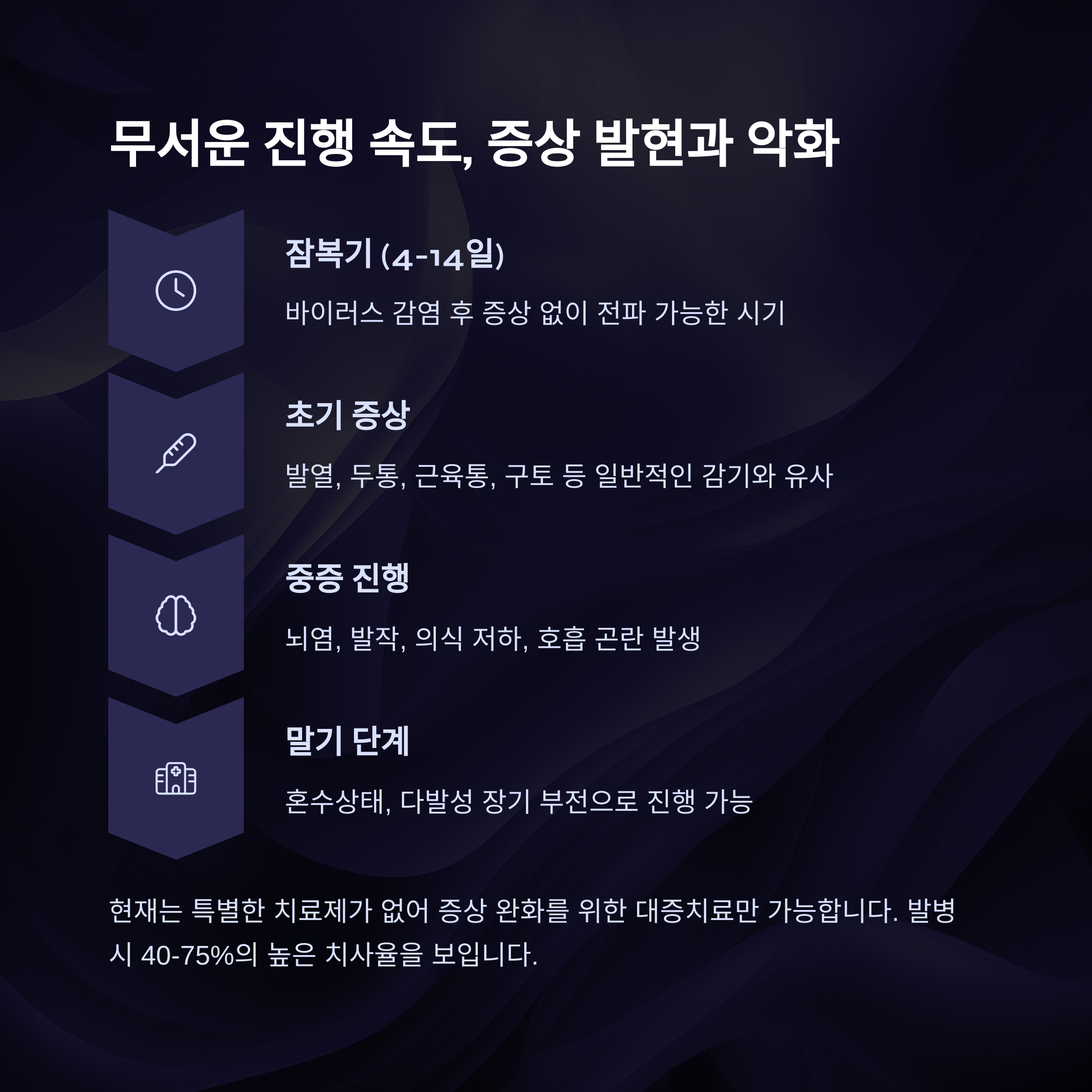 감염 후 며칠 내에 중증으로 악화되며, 대부분의 사망자는 신경계 증상으로 진행됩니다.