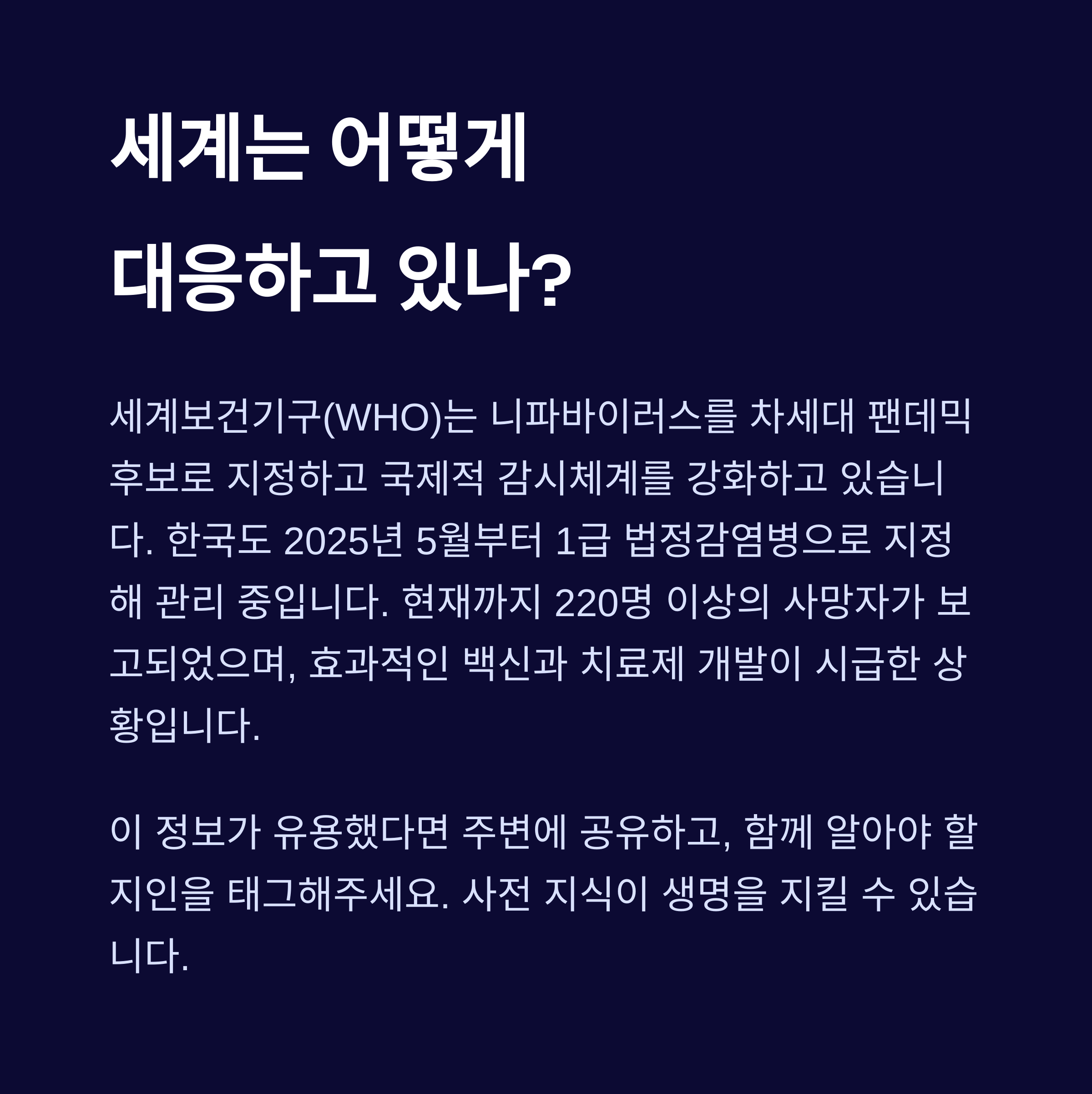 니파바이러스는 아직 멀게 느껴질 수 있지만, 전문가들은 이 바이러스가 언제든 전 세계를 위협할 수 있다고 경고합니다. 우리가 할 수 있는 것은 정보를 알고, 대비하고, 실천하는 것입니다.