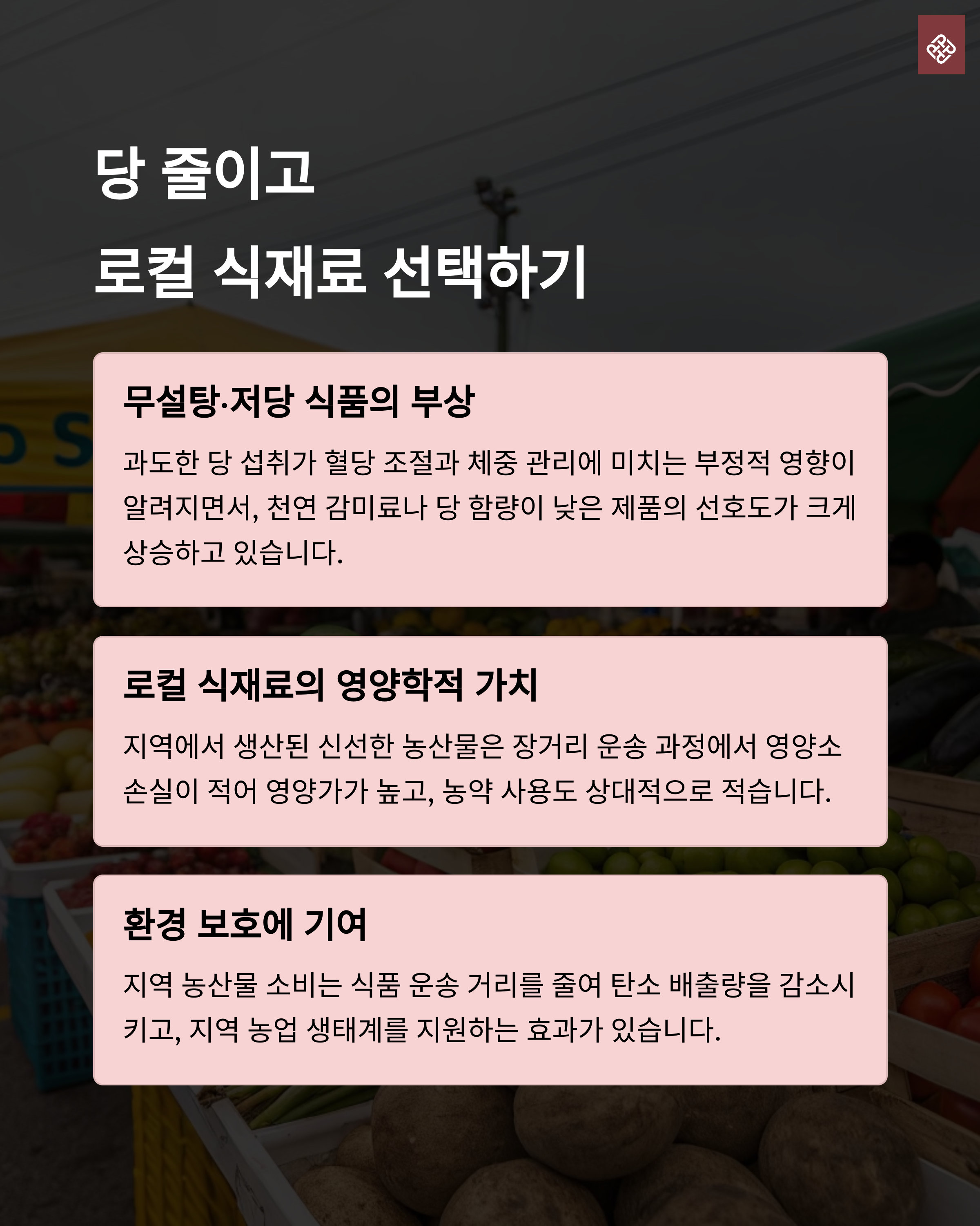 로컬 식재료는 신선도와 영양소 밀도가 높고, 유통 과정에서 발생하는 탄소 배출을 줄여 환경 보호에도 기여합니다.