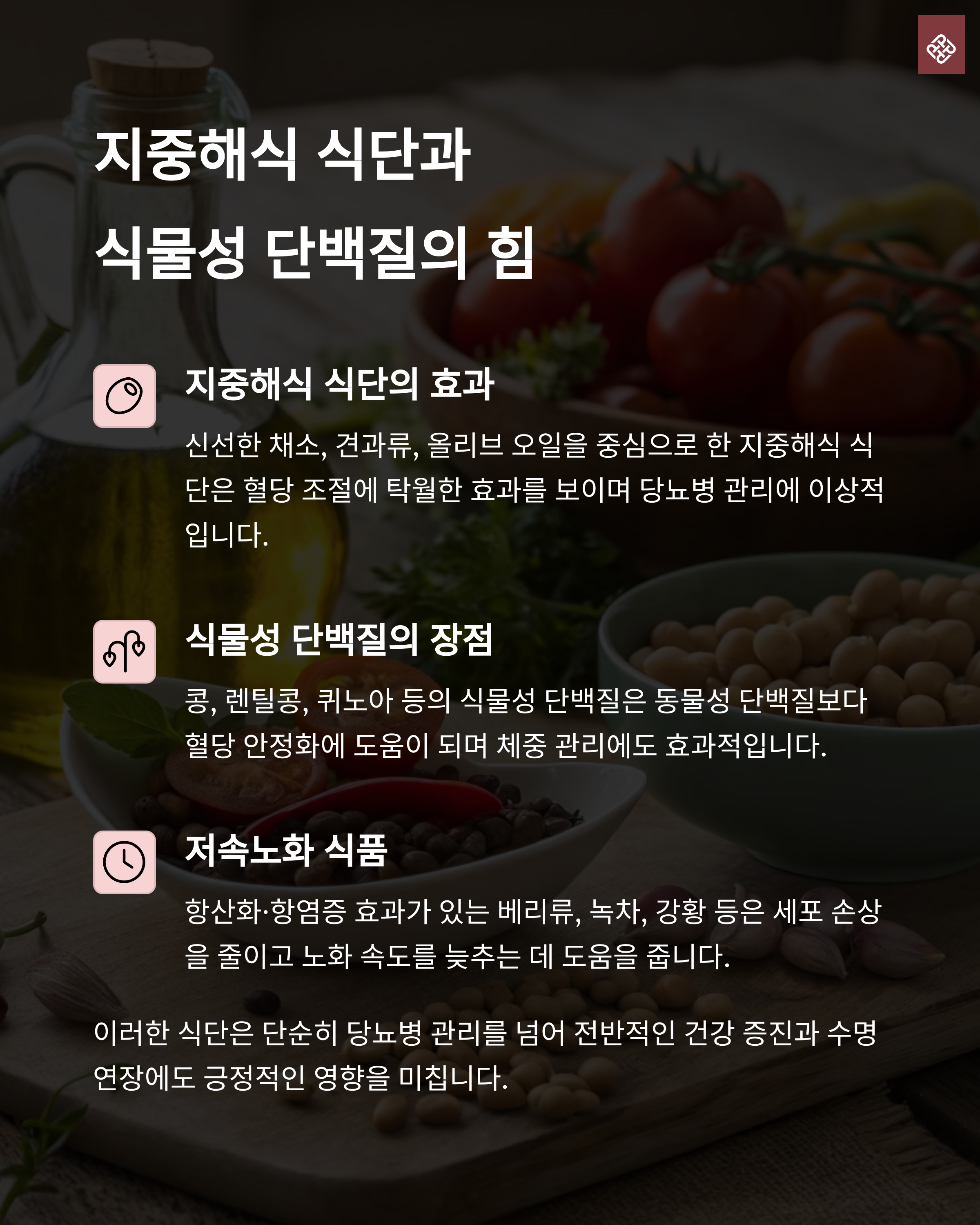지중해식 식단은 정제 탄수화물이 아닌 통곡물, 채소, 건강한 지방을 중심으로 구성됩니다. 혈당 스파이크를 방지하며, 균형 잡힌 영양 섭취가 가능합니다.