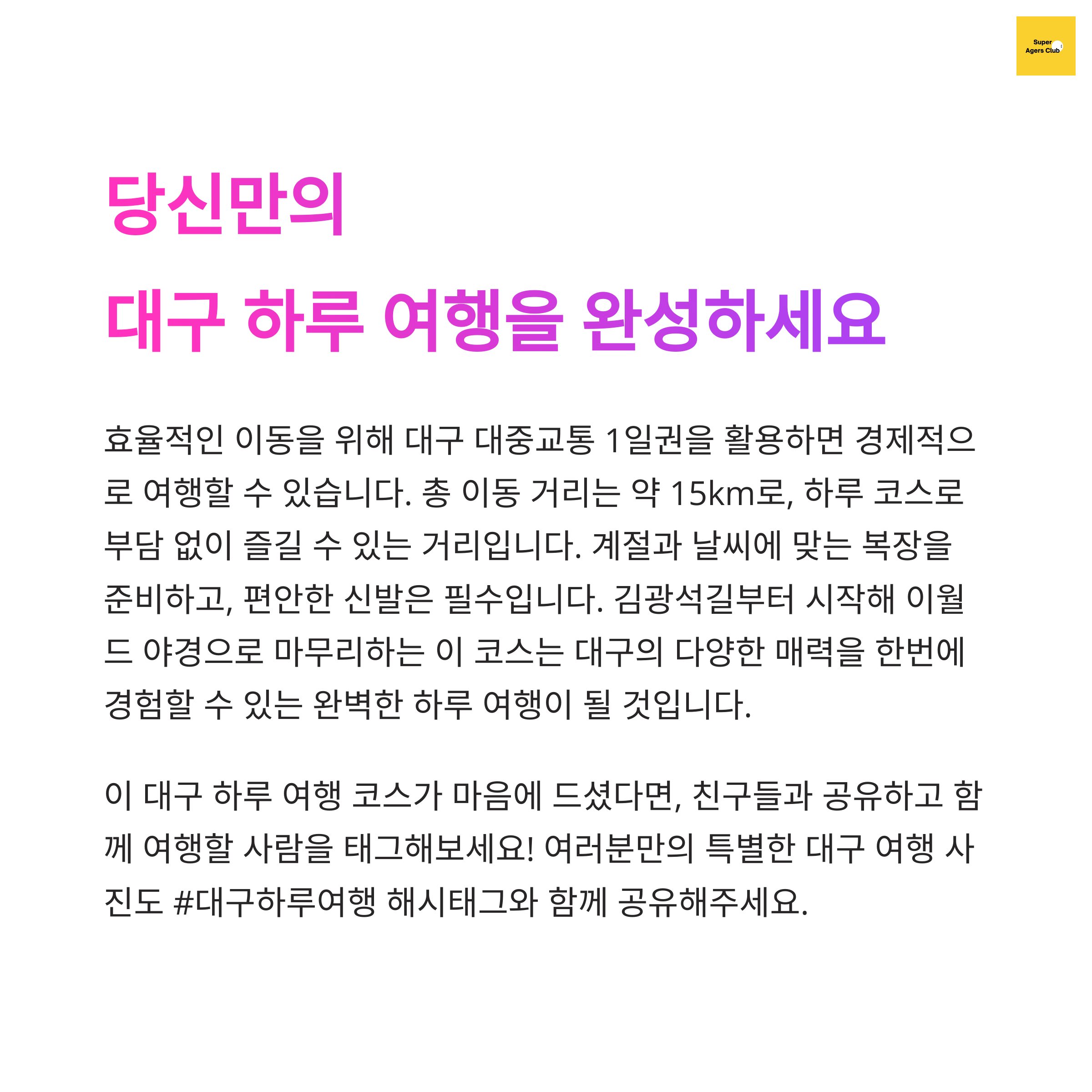 대구는 넓다고요? 아니에요! 도심에 핵심 명소가 딱 모여 있어서 하루에도 알차게 여행할 수 있어요.