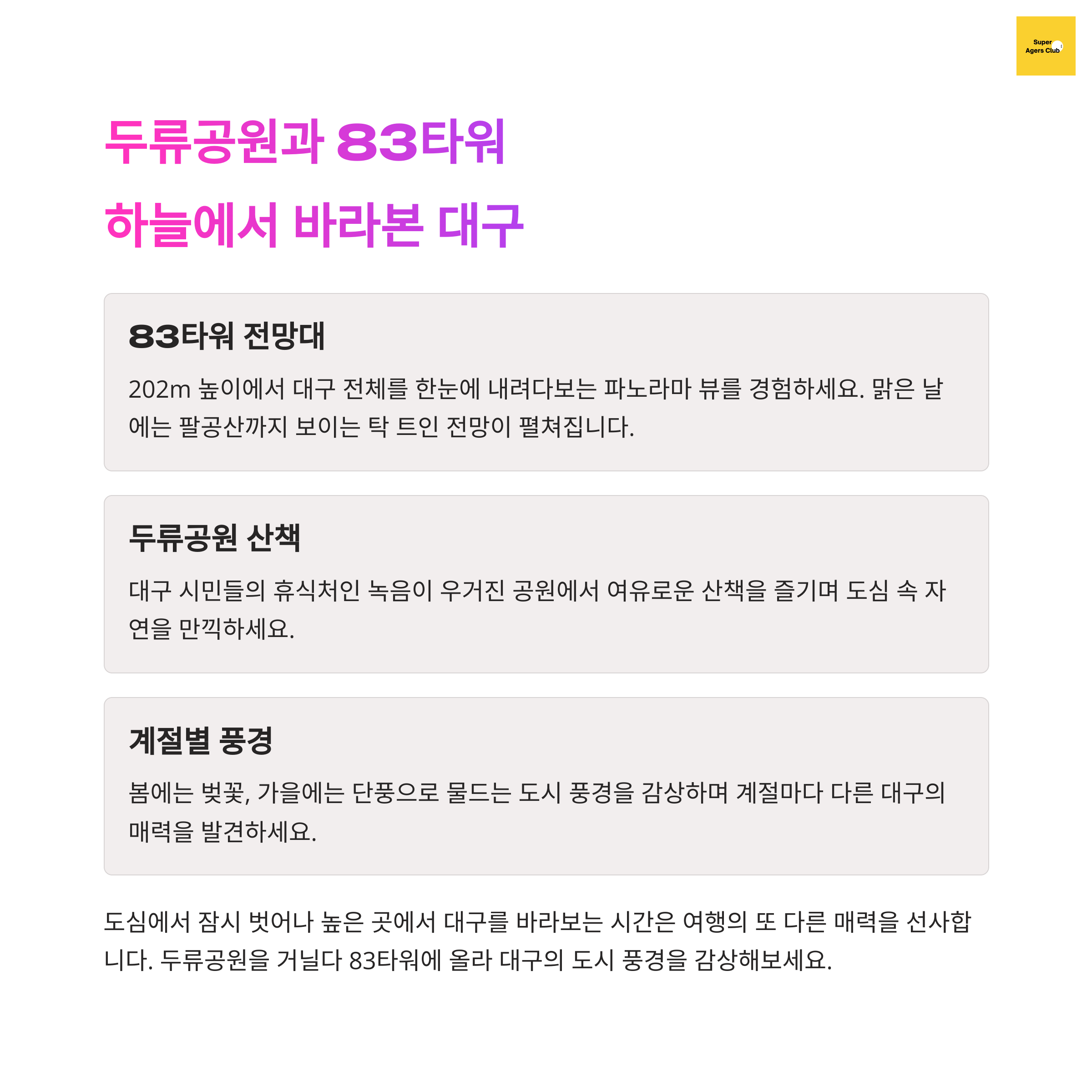 안녕하세요 여러분! 대구 여행을 계획하고 있는데 어디부터 가야 할지 고민 중이신가요? 저도 처음 대구에 갔을 땐 루트 짜느라 한참을 고민했는데요, 막상 다녀오고 나니 “와, 생각보다 이동 동선이 너무 좋다!” 하고 놀랐어요. 그래서 오늘은 대구 도심 속 핵심 여행지들을 효율적으로 도는 루트를 소개해드릴게요. 이대로만 따라가면 후회 없는 여행이 될 거예요!