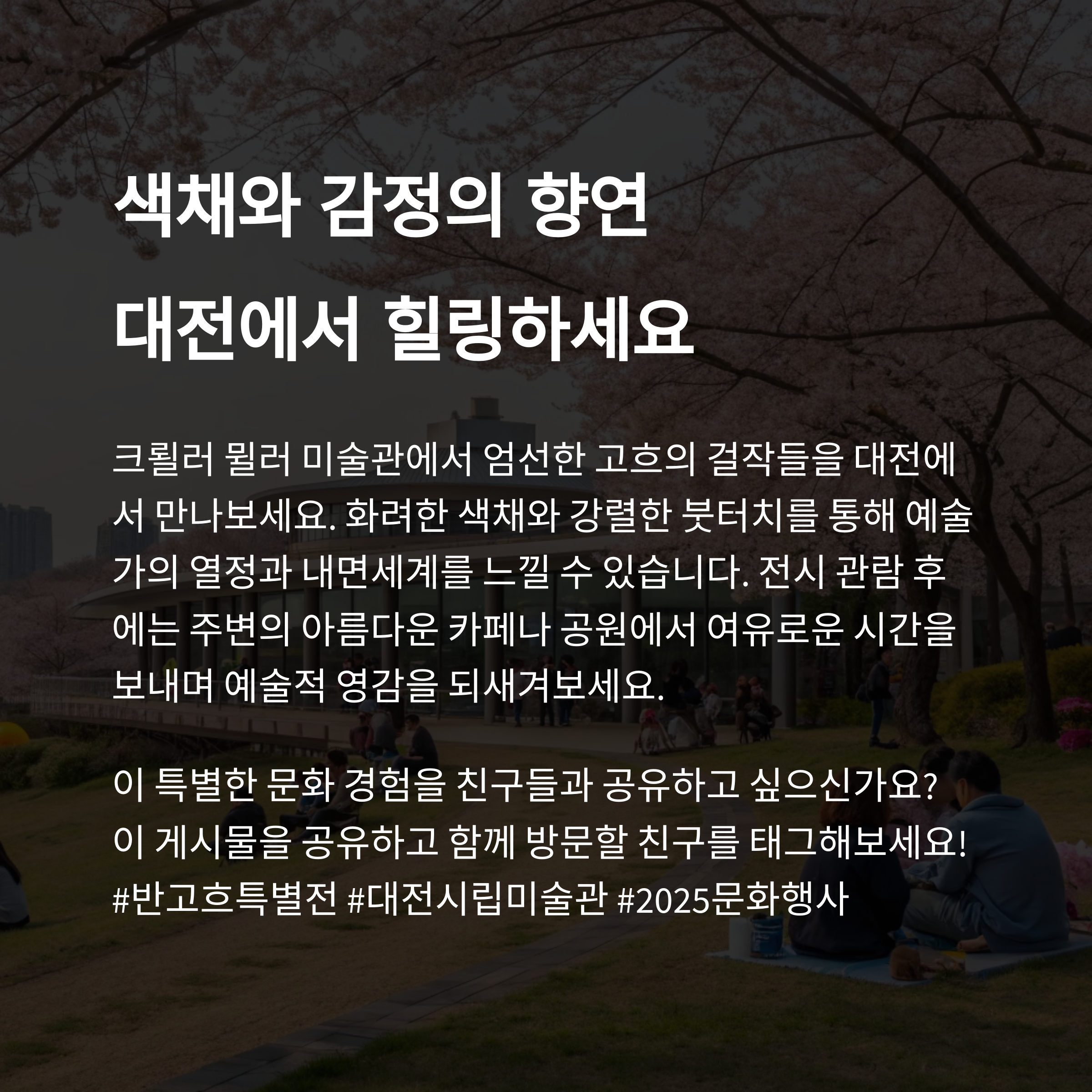 전시 관람 후에는 대전의 다양한 카페나 공원을 방문하여 여유로운 시간을 보내시는 것도 좋은 선택입니다. 이번 기회에 반 고흐의 예술을 통해 마음을 치유하고, 문화와 자연이 공존하는 대전에서 힐링을 만끽해보세요.