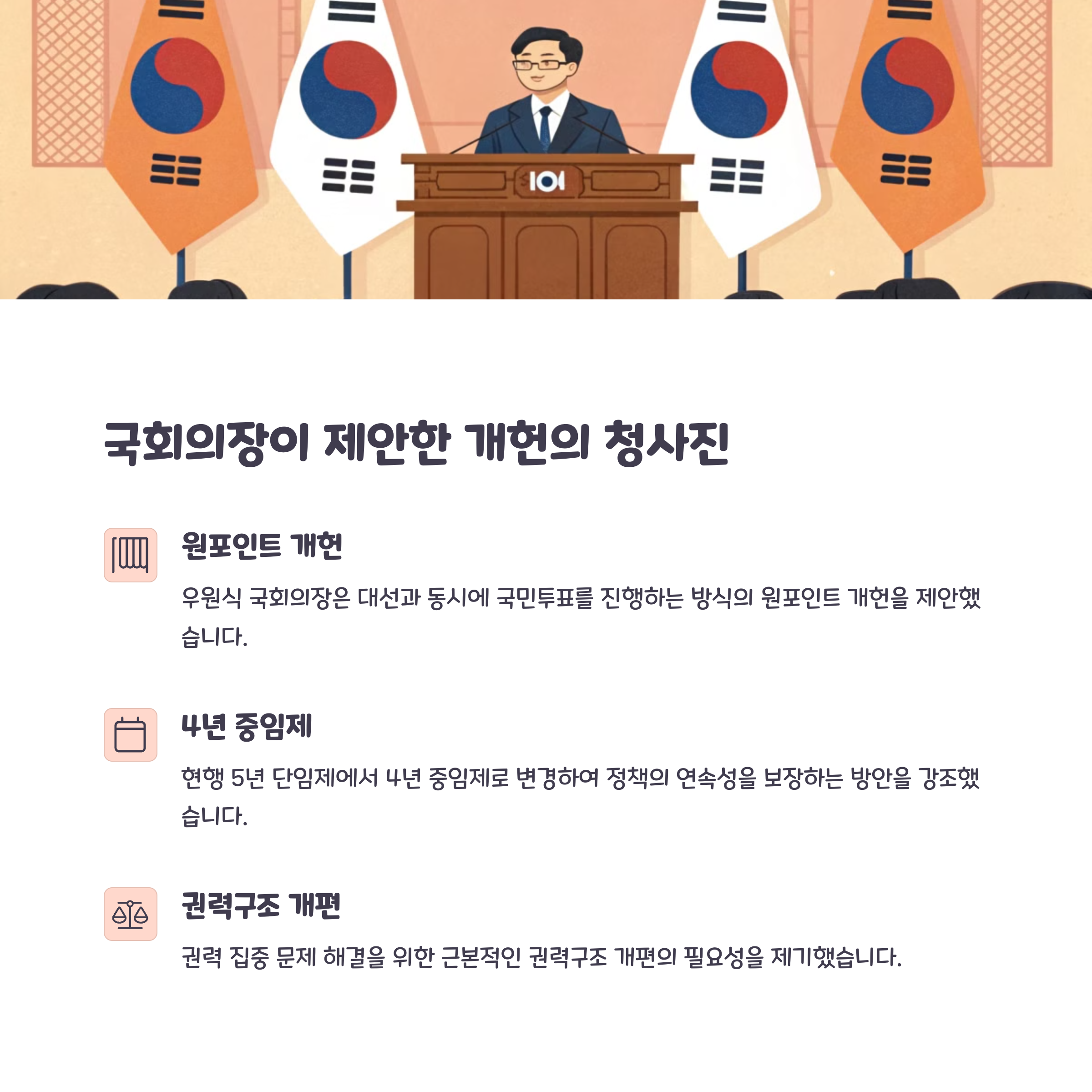 윤석열 전 대통령의 파면 이후 정치권에서는 대통령 임기제 개편 논의가 활발해지고 있습니다. 우원식 국회의장은 국민투표와 대통령 선거를 동시에 시행할 수 있는 원포인트 개헌안을 제안하며, 개헌을 통해 정치적 혼란을 대전환의 기회로 만들자는 입장을 밝혔습니다. 이러한 논의의 핵심은 대통령 권력 구조 개편으로, 4년 중임제 도입 여부가 주요 쟁점으로 떠오르고 있습니다.