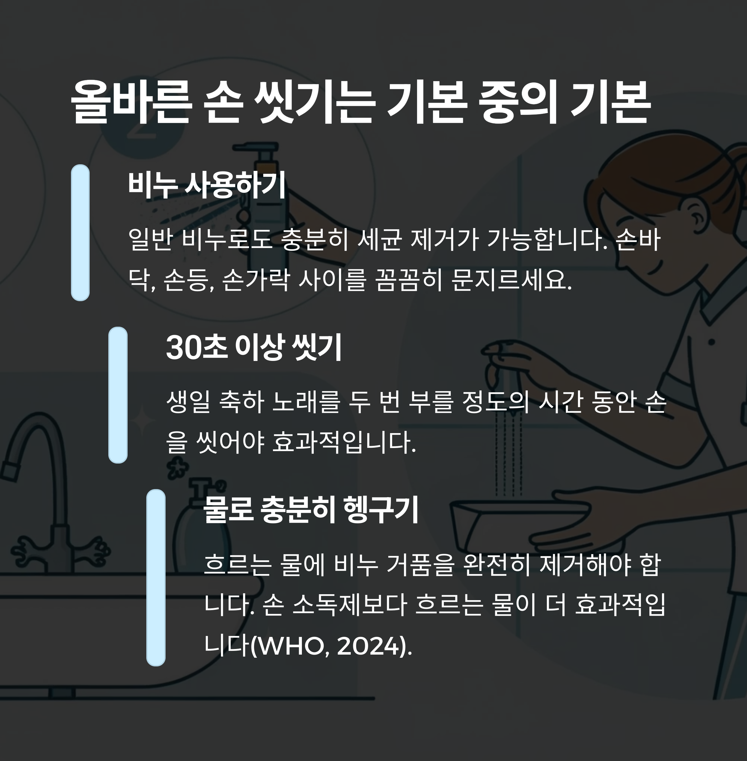 비누를 이용해 30초 이상 손등, 손바닥, 손가락 사이, 손톱 밑까지 꼼꼼히 문질러 씻는 것이 가장 효과적입니다. 손건조도 중요하니 타올 또는 자연건조를 권장합니다.