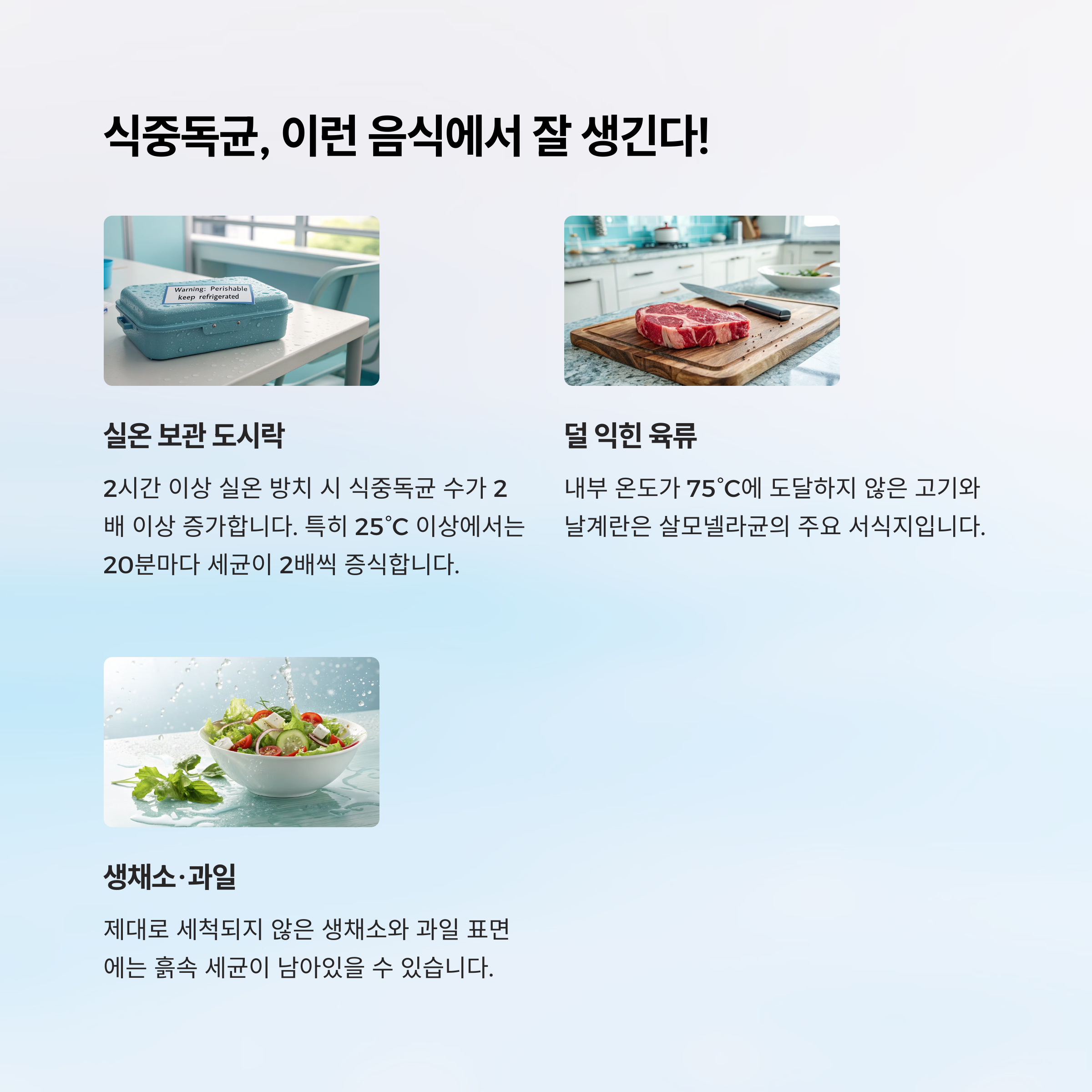 육류, 계란, 해산물 등은 반드시 속까지 익었는지 확인하고, 조리 중간에 칼이나 도마를 재사용하는 것도 피해야 합니다.