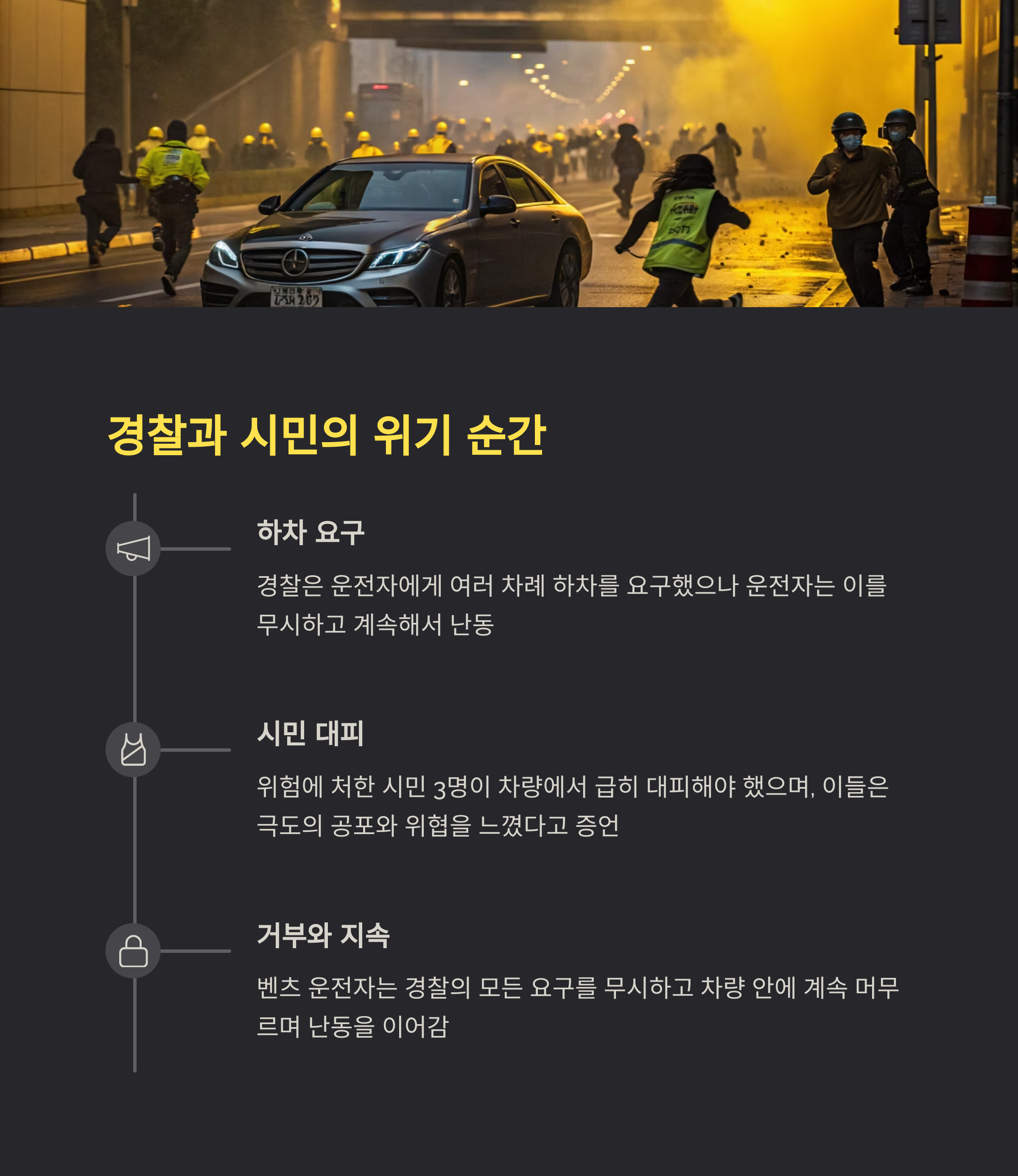 - 벤츠 차량의 급가속·급제동 반복, 전후진 시도로 차량 포위망 흔듦