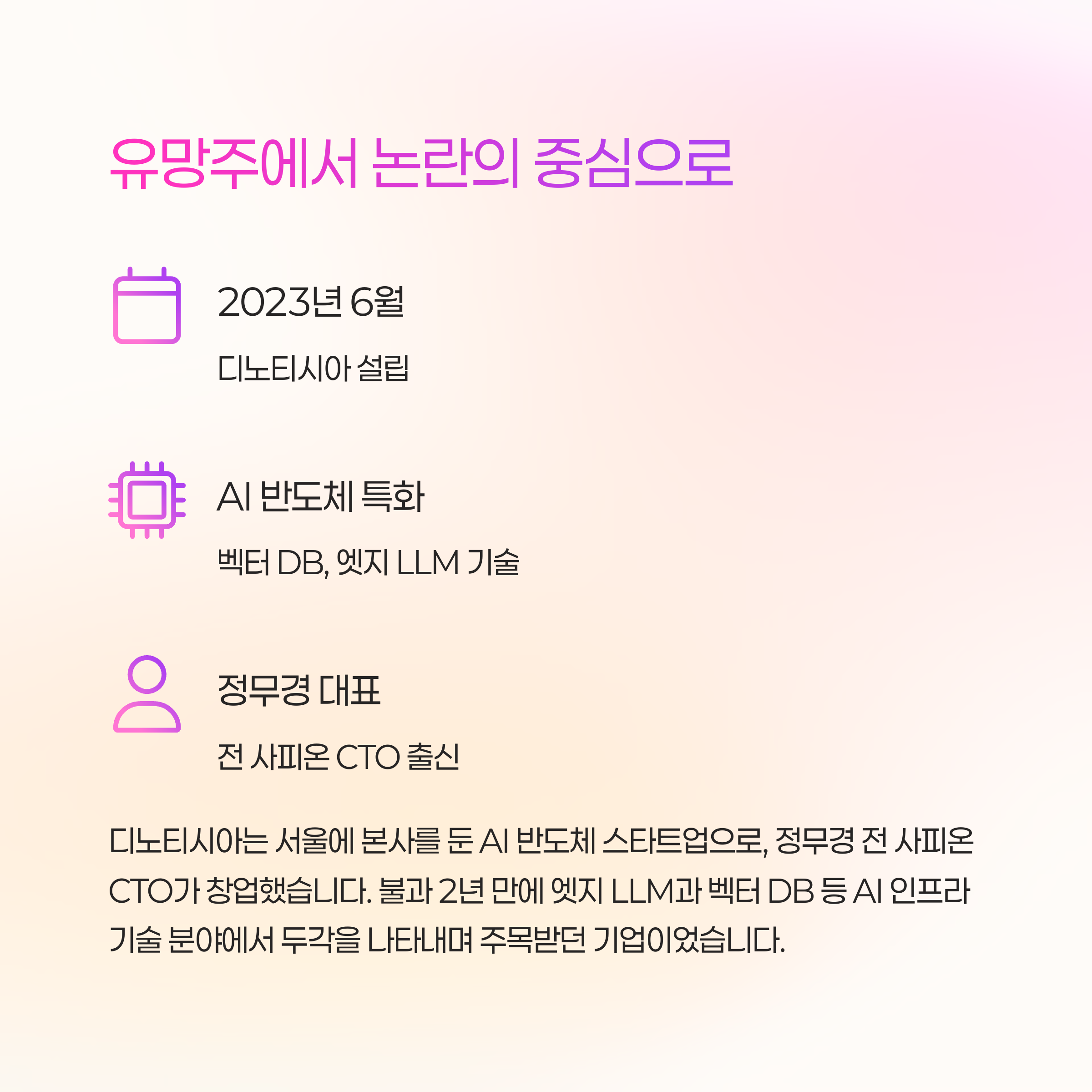 AI 반도체 스타트업으로, 2023년 설립 후 빠르게 주목받은 기업입니다. 사피온 출신 인재들이 대거 참여했습니다.