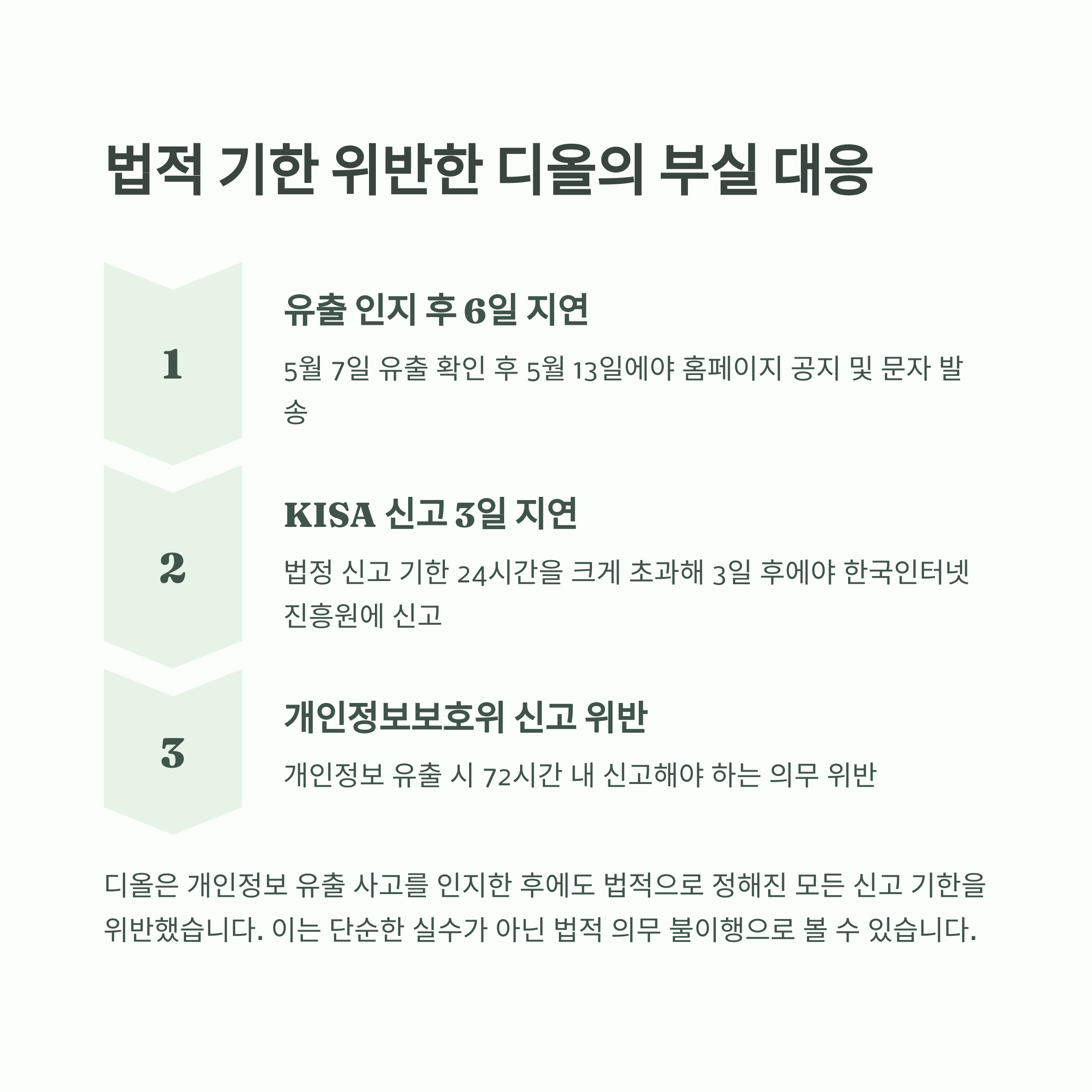 디올 측은 내부 조사 및 외부 보안기관 분석 결과를 기다리느라 늦었다고 해명했지만, 이에 대해 많은 비판이 제기되고 있습니다.