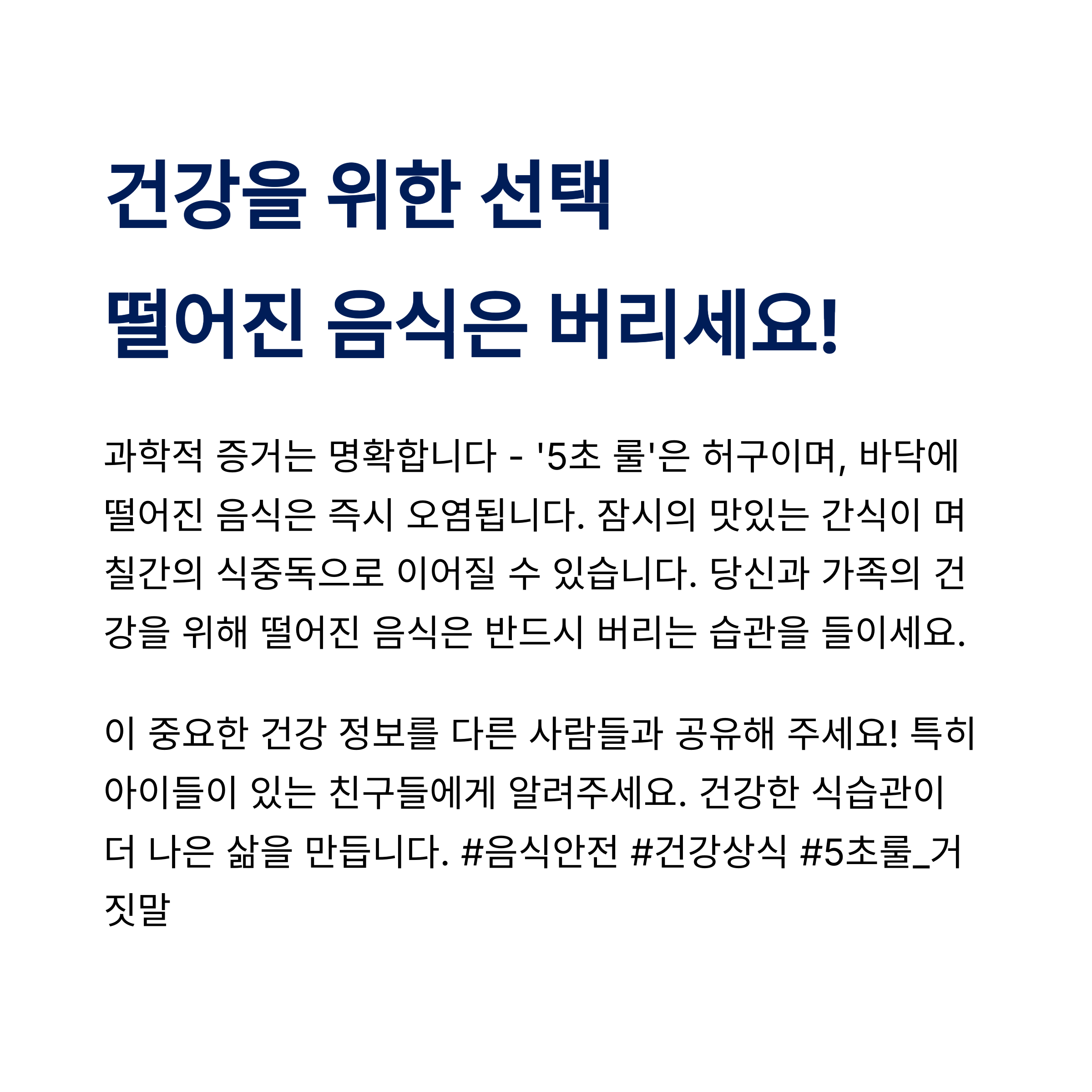 우리가 무심코 지나쳤던 '5초 룰', 이제는 다시 생각해볼 때입니다. 눈에 보이지 않는 세균은 단 1초만으로도 음식에 옮겨 붙고, 이는 때로는 심각한 건강 문제로 이어질 수 있습니다. 위생은 거창한 것이 아니라, 떨어진 음식을 주워 먹지 않는 사소한 습관에서부터 시작됩니다. 오늘부터라도 “이 정도는 괜찮겠지”라는 생각 대신 “건강을 위해 조심하자”는 인식으로 바꾸어보세요. 작은 실천이 평생의 건강을 지키는 첫걸음이 될 수 있습니다.