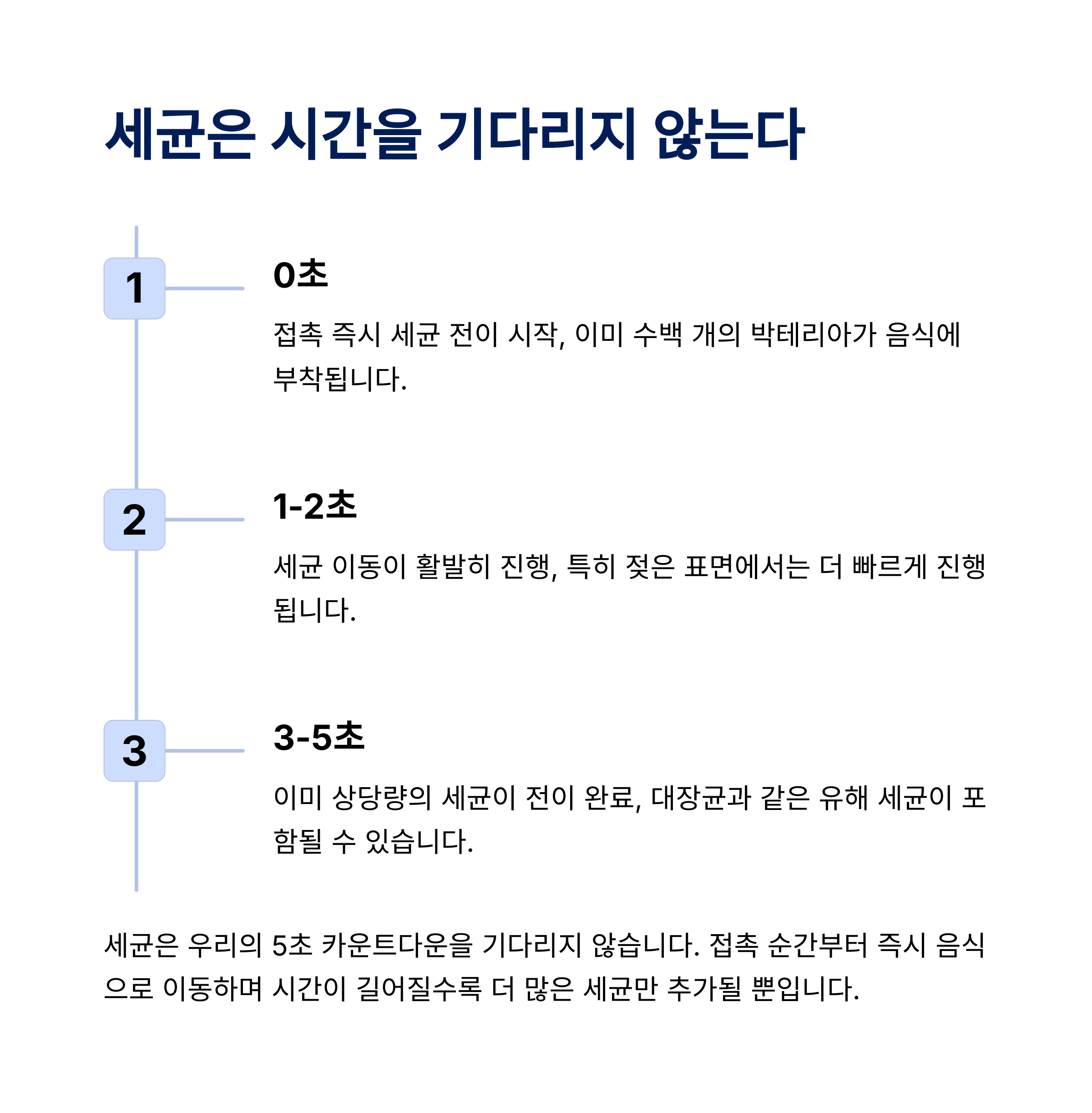 세균은 접촉 즉시 음식에 달라붙고, 몇 시간 내에 수천 배 이상 증식할 수 있습니다. 이처럼 짧은 시간이라도 인체에 위험을 줄 수 있는 감염원이 될 수 있다는 사실을 기억해야 합니다.