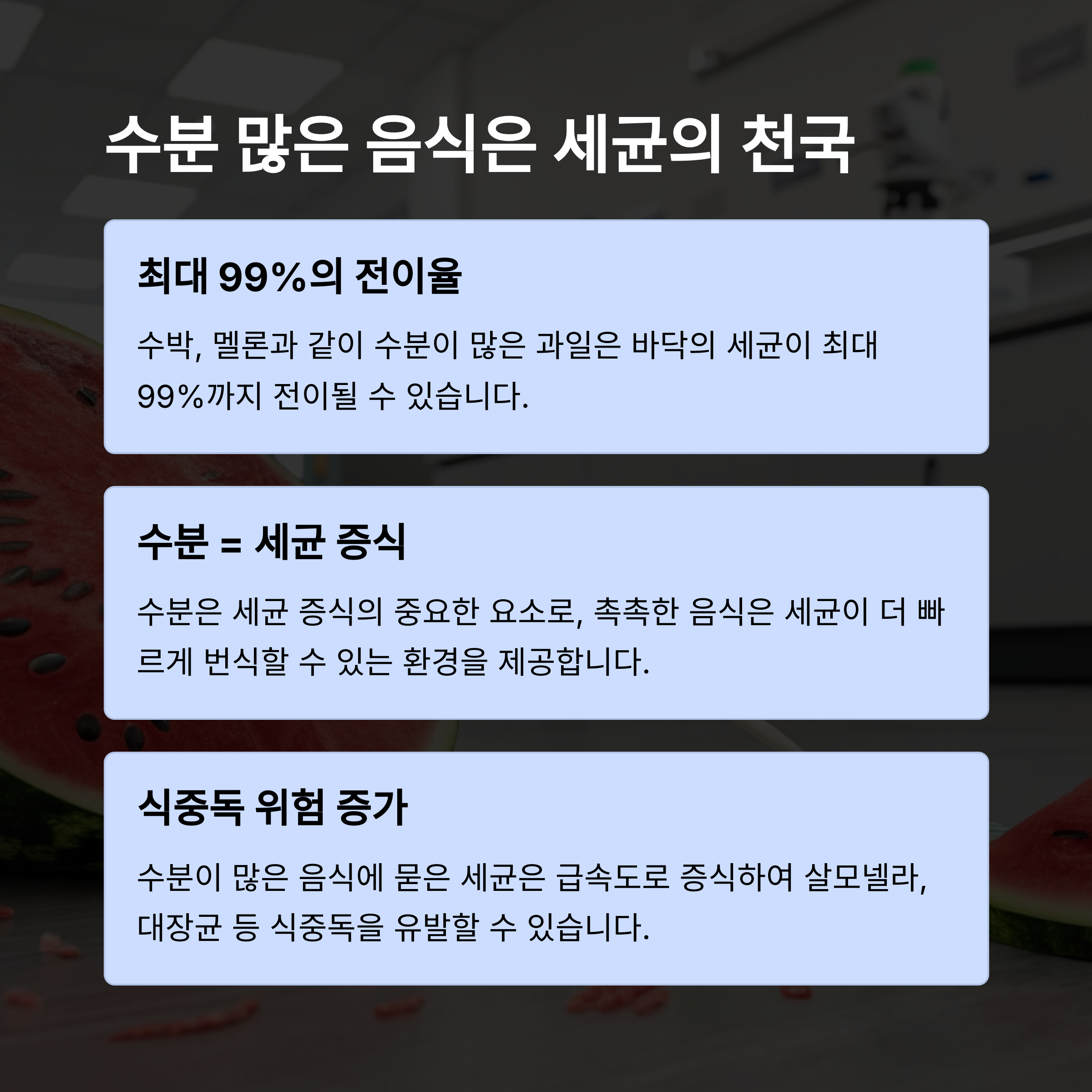 주로 수분이 많거나 끈적한 표면을 가진 음식들이며, 이런 음식은 세균이 더 쉽게 달라붙고 증식하기 좋은 환경이 됩니다. 특히 어린이나 면역력이 약한 사람에게는 더욱 위험할 수 있습니다.