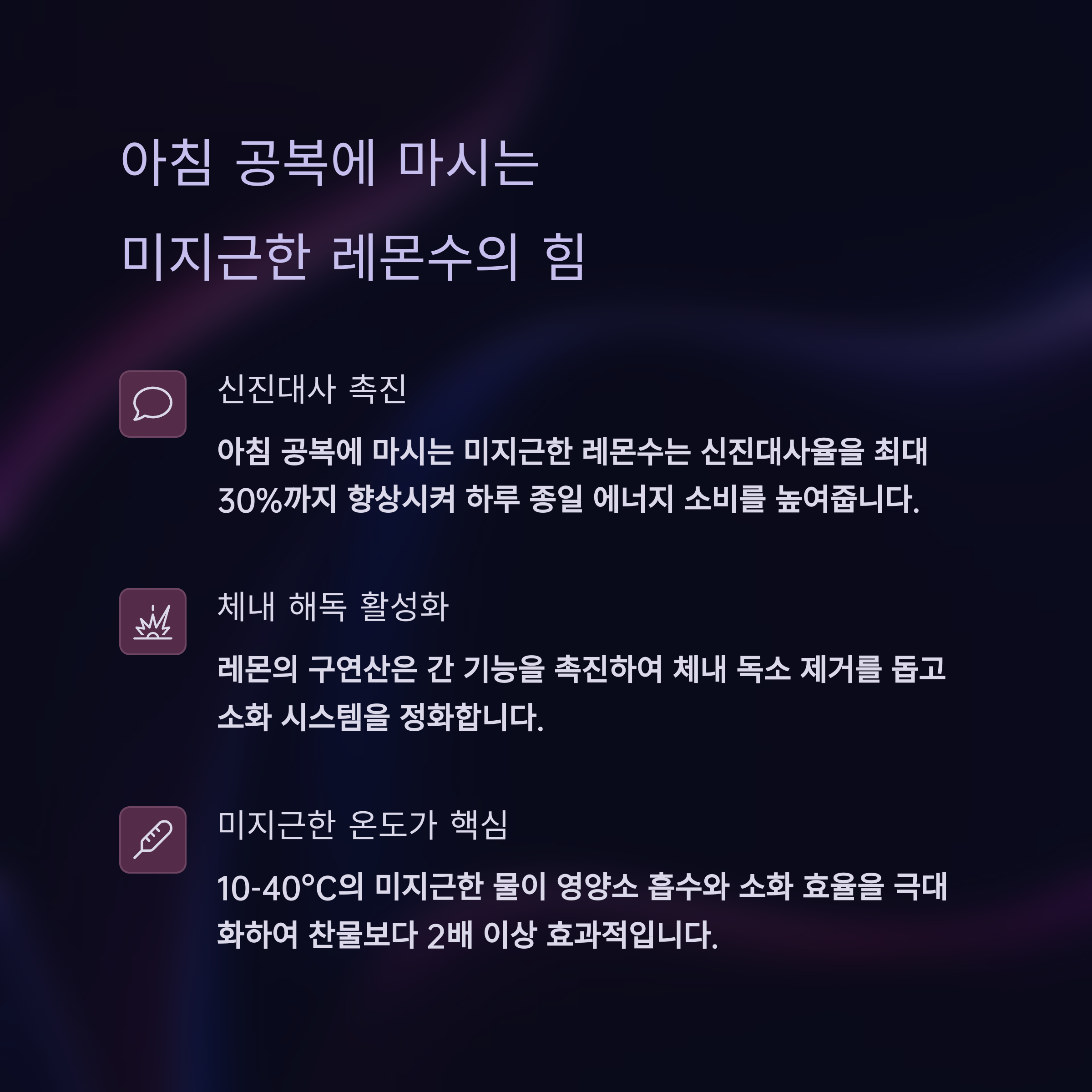 아침 공복에 미지근한 레몬수를 마시면 신진대사가 활발해지고 체내 해독을 촉진합니다. 레몬의 구연산이 간 기능을 도와 노폐물 제거에 효과적입니다. 또한, 비타민 C와 항산화 성분이 피로 회복에 도움을 주어 아침을 활기차게 시작할 수 있습니다.