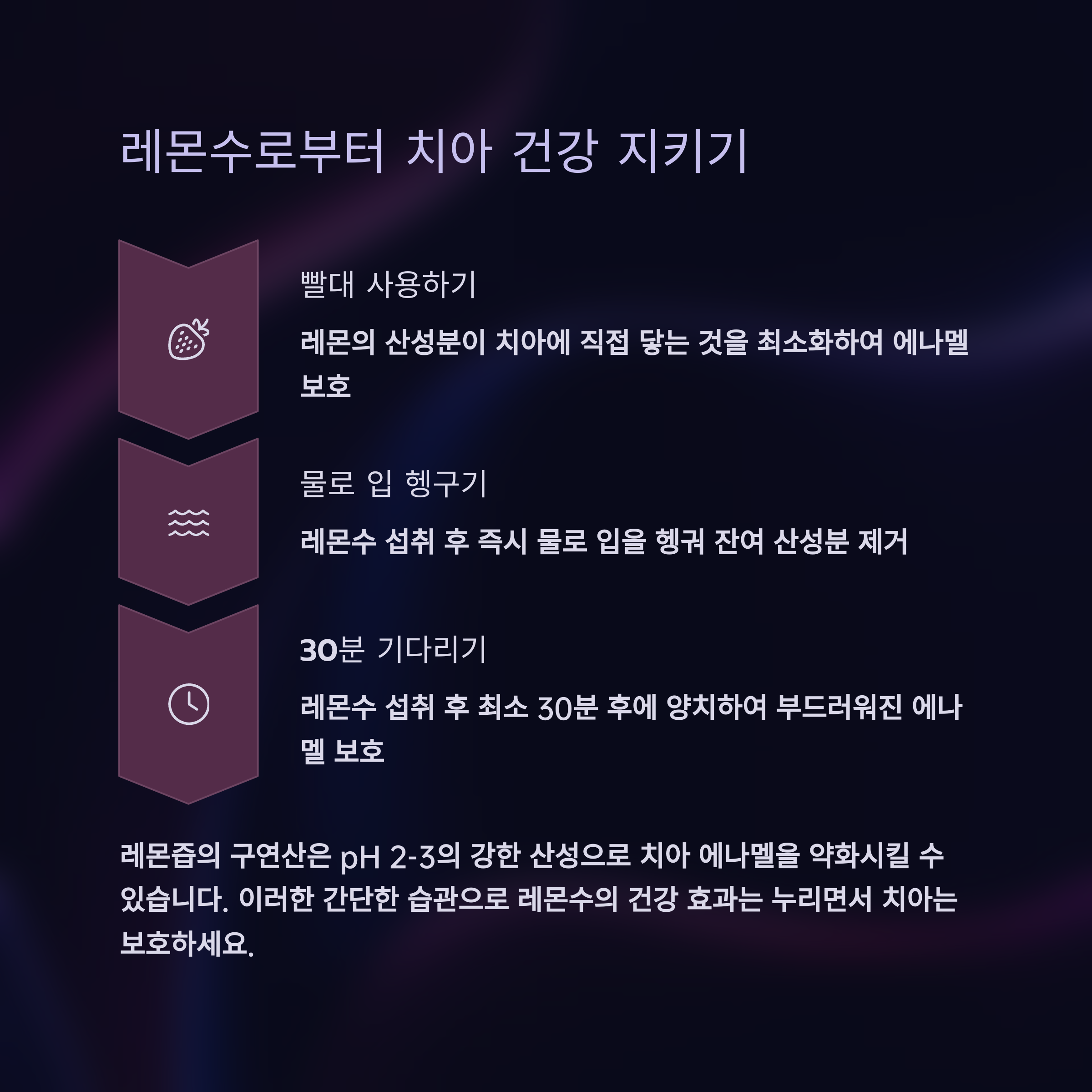 레몬즙은 산 성분이 강해 치아 에나멜을 부식시킬 위험이 있습니다. 레몬수를 마실 때 빨대를 사용하여 치아에 직접 닿지 않도록 하는 것이 좋습니다. 또한, 음용 후에는 바로 물로 입안을 헹구어 산 성분을 희석하여 치아를 보호하세요. 칫솔질은 음용 후 30분이 지난 후에 하는 것이 에나멜 손상을 줄이는 데 도움이 됩니다.