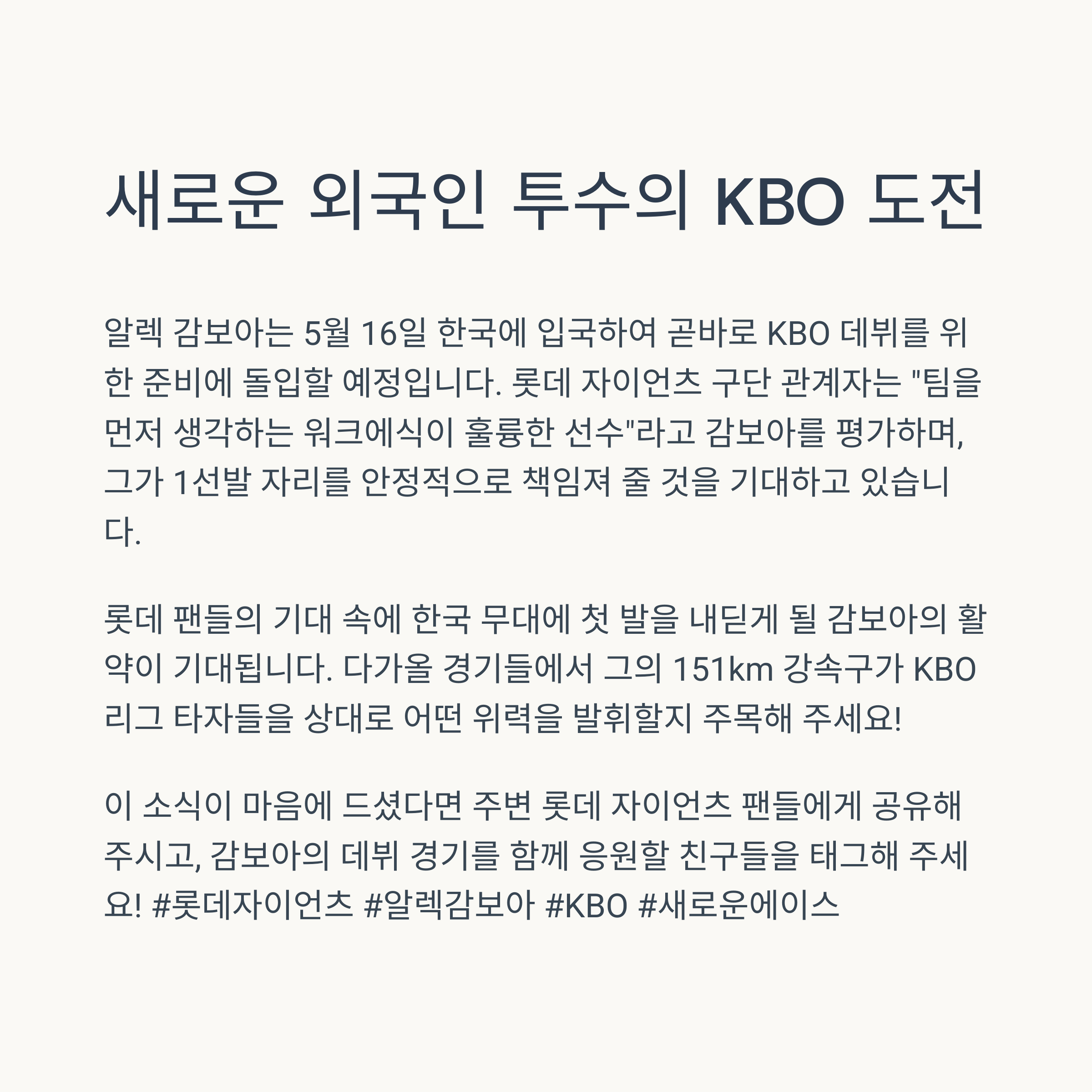 안녕하세요, 야구팬 여러분! 최근 KBO판에 아주 반가운 뉴스가 들려왔습니다. 바로 롯데 자이언츠가 새 외국인 투수 알렉 감보아를 영입했다는 소식이에요. 기존 외국인 투수 찰리 반즈의 부상으로 인한 장기 이탈이 예상되면서 팀은 빠르게 움직였고, 그 결과 LA 다저스 트리플A 출신의 강속구 좌완을 영입하는 데 성공했습니다. 이번 교체는 단순히 숫자상의 보강이 아니라, 팀의 분위기 전환과 시즌 후반부까지 내다본 전략적인 선택이라는 점에서 더욱 흥미로운데요. 이제 우리는 이 감보아라는 선수가 어떤 인물인지, 어떤 투수인지, 그리고 롯데의 현재 상황과 어떤 시너지를 낼 수 있을지 차근차근 짚어볼 예정입니다. 야구는 흐름의 스포츠잖아요. 흐름을 바꿀 수 있는 ‘단 한 명’이 등장한 지금, 여러분과 함께 그 스토리를 따라가 보려 합니다.