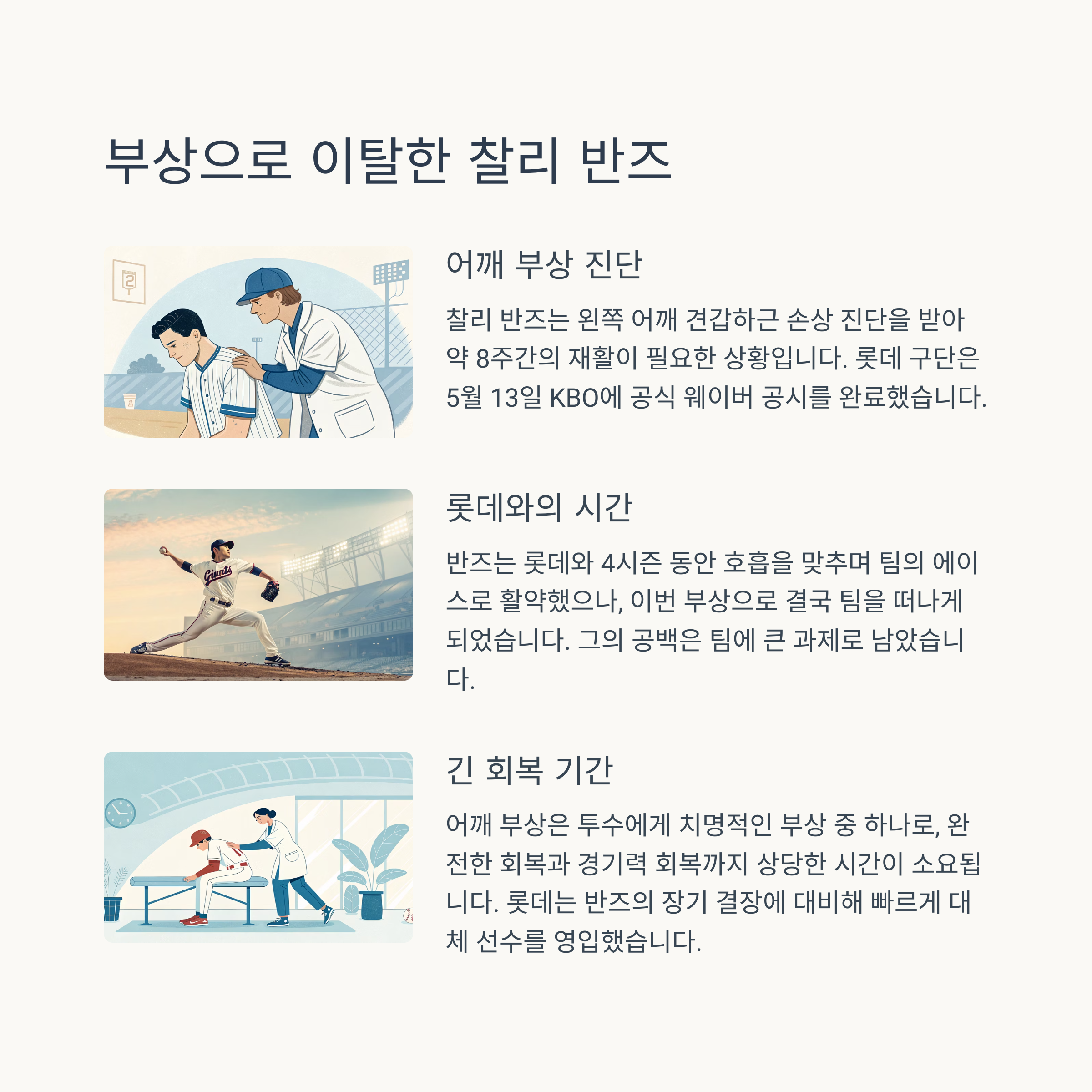 롯데의 외국인 투수 찰리 반즈는 2022년부터 3년간 팀의 에이스 역할을 해왔습니다. 그러나 이번 시즌은 여러모로 고전이었죠. 성적은 물론, 몸 상태까지 문제였습니다. 8경기 출전해 3승 4패, 평균자책점 5.32라는 성적표에 더해, 결국 왼쪽 어깨 부상까지 겹치면서 최소 8주간 이탈하게 됐습니다. 이런 상황에서 롯데가 기다리기보다는 빠르게 대체 카드를 꺼내든 건, 순위 싸움이 치열한 KBO의 특성상 너무나 당연한 전략이었습니다.