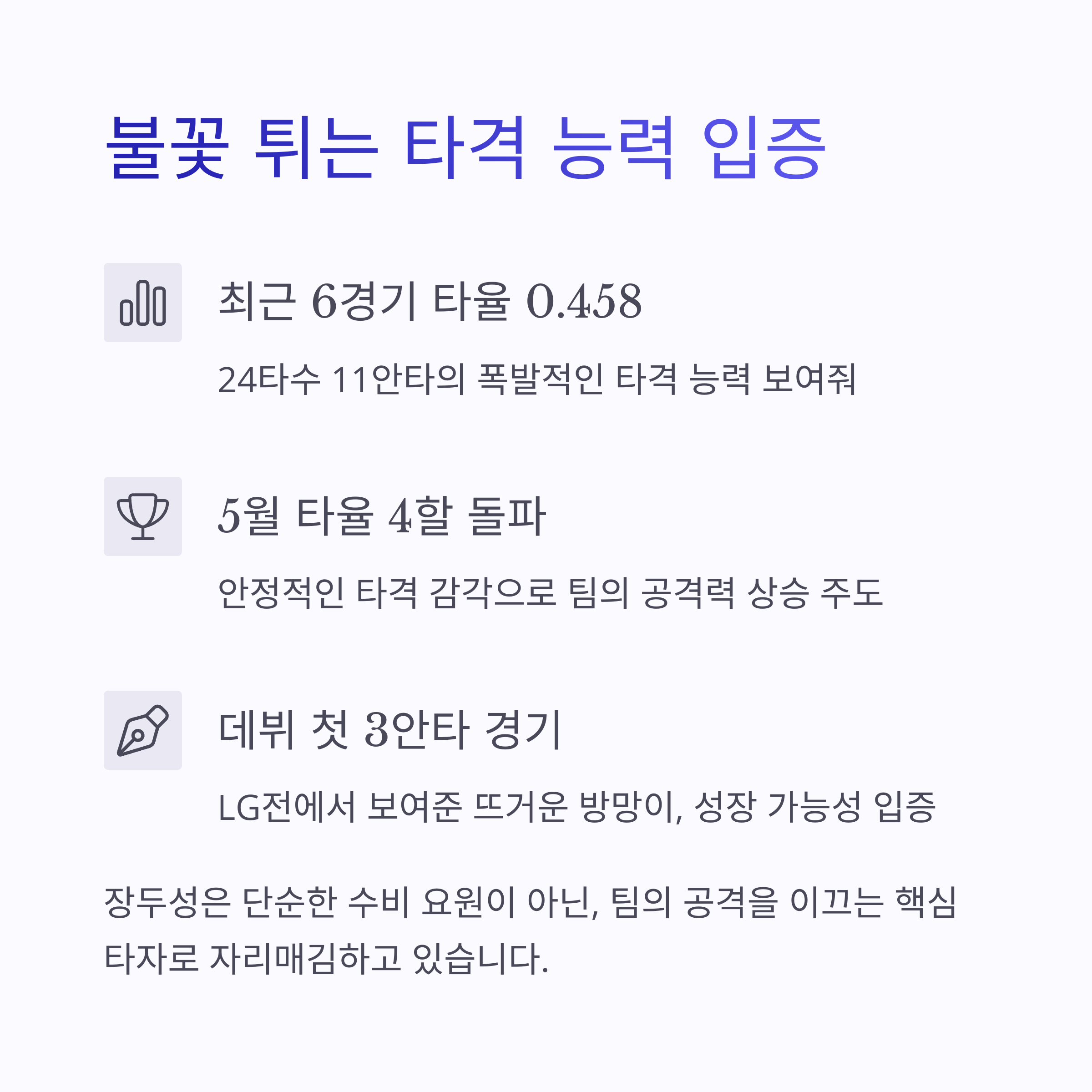 그동안 대주자와 대수비 위주로 기용되던 백업 선수였지만, 2025 시즌을 기점으로 주전급 리드오프로 도약했습니다.