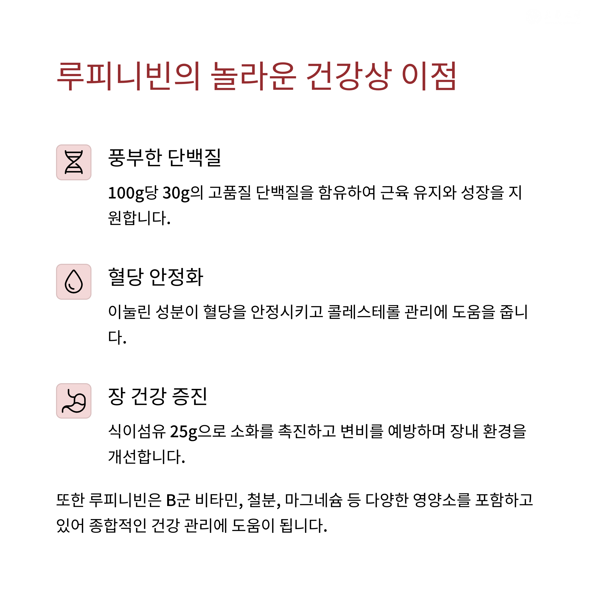 인슐린 민감도 개선, 포만감 증대, LDL 콜레스테롤 저하 등 다양한 건강 기능성이 함께 보고되고 있는 만큼, 루피니빈은 단순한 콩류 그 이상으로 평가받고 있습니다.