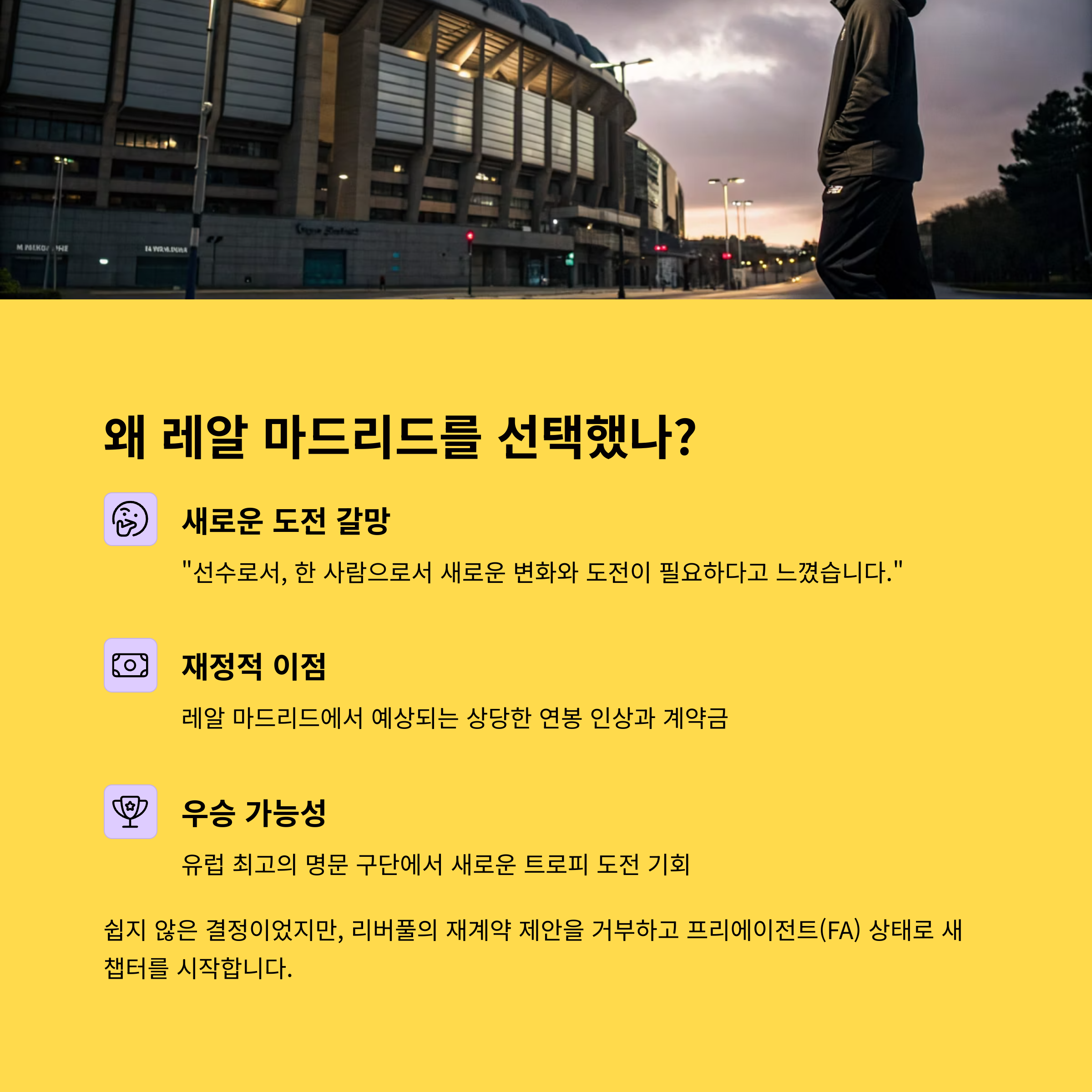 트렌트 알렉산더-아놀드의 이적은 많은 이들의 예상 밖 선택이었지만, 자세히 들여다보면 몇 가지 배경이 포착됩니다. 우선 클롭 감독의 퇴임 이후 팀의 리빌딩 불확실성은 핵심 동기 중 하나였어요. 또한 리버풀과의 재계약 협상이 지지부진했던 것도 결정적인 원인으로 작용했죠. 반면, 레알 마드리드는 새로운 ‘은백 전설’의 시작을 위해 트렌트를 주전 풀백으로 낙점하며 확실한 비전을 제시했습니다. 트렌트 입장에선 축구 인생의 황금기를 안정적인 프로젝트 아래 보장받고 싶은 욕망이 컸을 겁니다.
