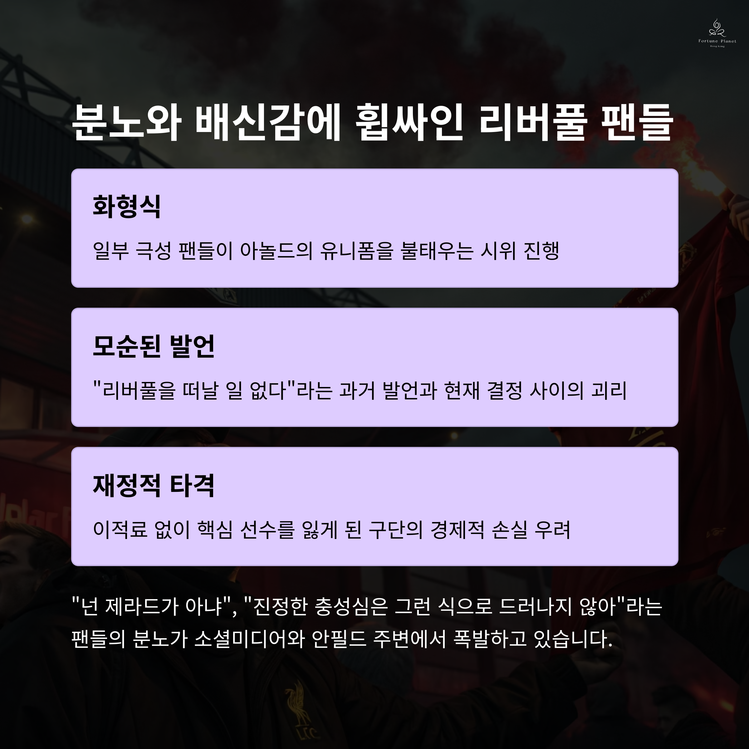 아놀드의 이적은 단순한 이적 이상의 감정적 상처를 남겼습니다. 리버풀 팬들이 분노한 지점은 크게 네 가지로 요약됩니다. 그의 로컬 보이 정체성, 충성심을 내세운 과거 발언, 팀 내 리더십 역할, 마지막으로 자유계약으로 떠났다는 점에서 팬들은 ‘배신감’을 느끼고 있어요.