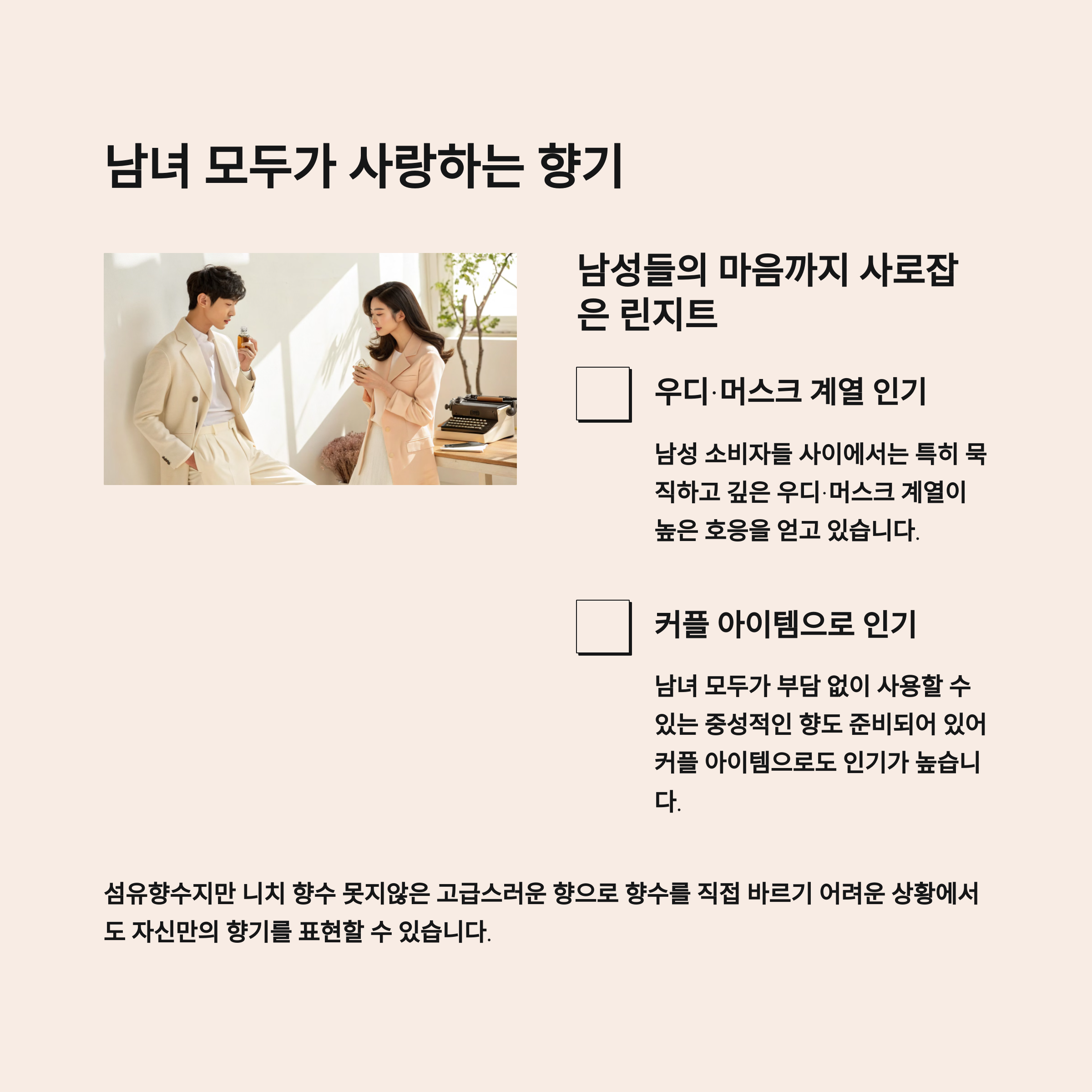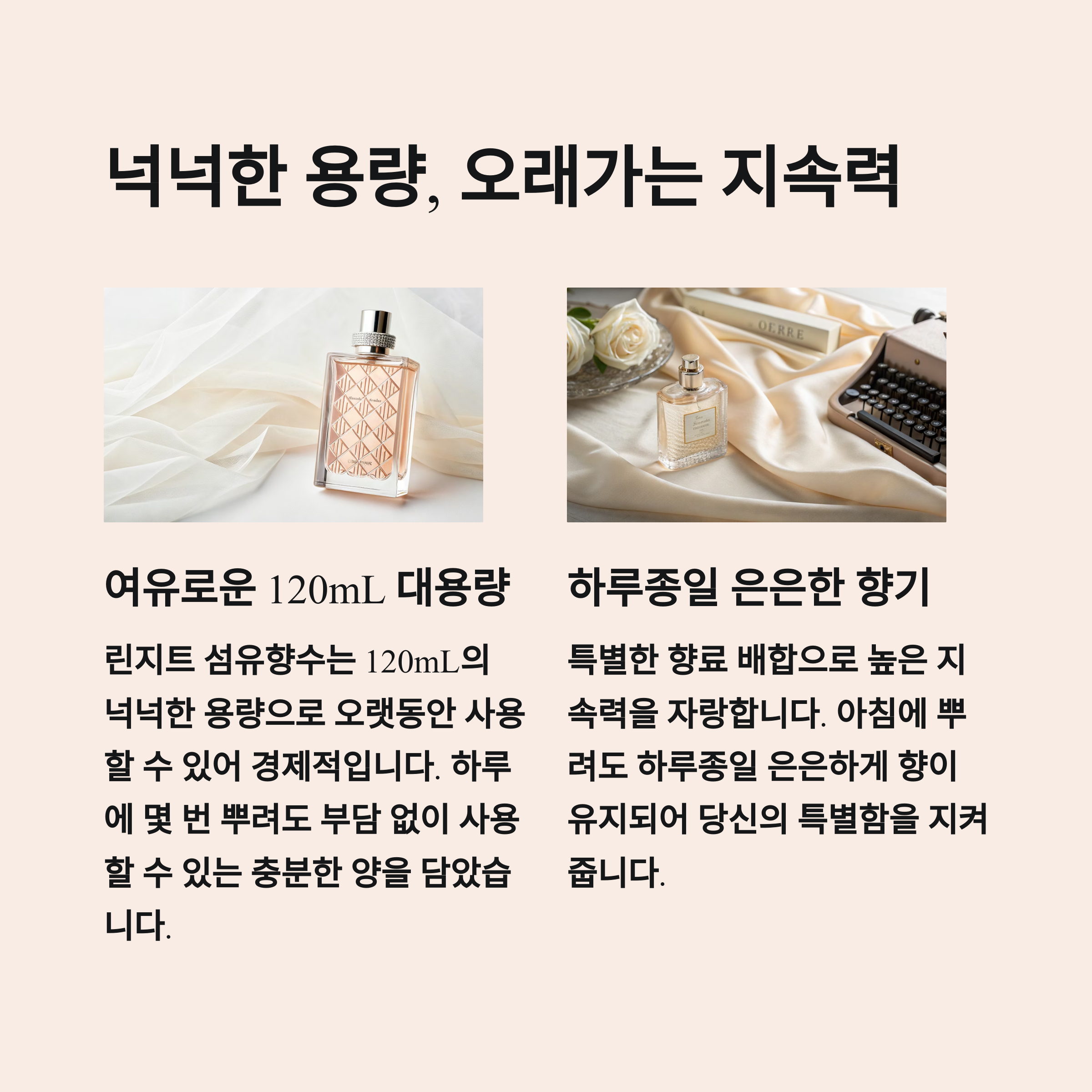 린지트 섬유향수가 인기인 이유는 단순히 ‘좋은 향’ 그 이상이에요. 고급 니치 향수와 비슷한 향조를 섬유향수로 구현했다는 점이 소비자들의 감각을 자극했고, 가격도 합리적이라 누구나 부담 없이 시도해볼 수 있습니다. 특히 남성 고객들 사이에서도 “향이 남자 향수 뺨친다”는 후기가 있을 정도로 중성적이고 세련된 향이 인기를 끌고 있어요.