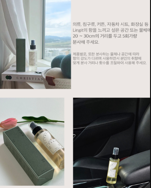 | 외출 전 옷 | 재킷, 니트 등에 20cm 이상 거리에서 분사하면 잔향이 오래감 |