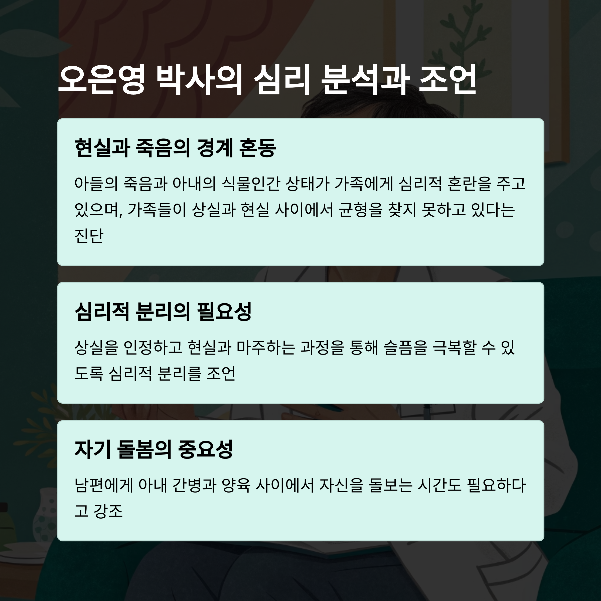 죄책감과 사랑이 겹쳐진 감정 속에서 그는 자신이 해야 할 일이라 믿고 있습니다. 다만 방송에서는 그 헌신이 오히려 위험할 수 있다는 점을 짚고 있습니다.