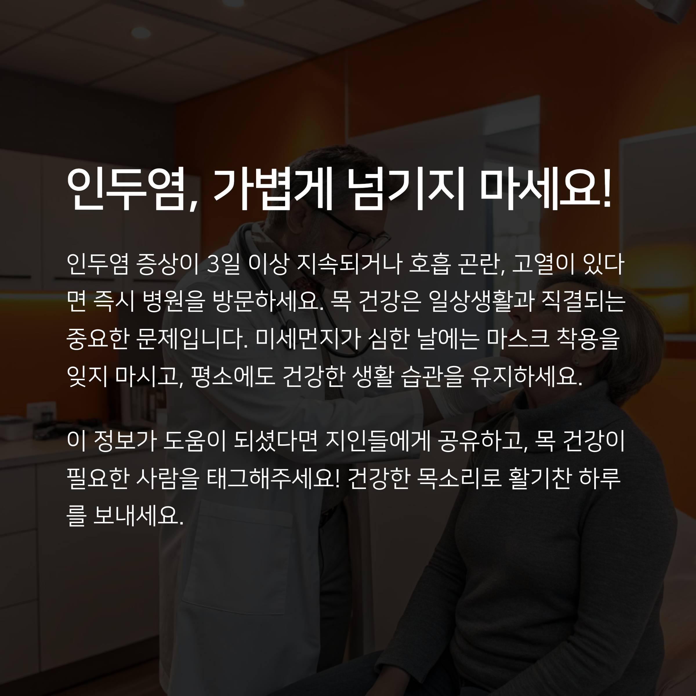 목이 따끔하거나 칼칼한 느낌이 들 때, 대수롭지 않게 넘기기 쉽습니다. 하지만 그 뒤에 숨어 있는 다양한 염증 질환을 놓친다면 회복에 더 많은 시간과 비용이 들 수도 있어요. 오늘 소개해드린 자가진단 방법과 초기 대처법은 누구나 쉽게 실천할 수 있는 것들입니다. 특히 겨울철엔 더더욱 민감하게 반응해야 하죠. 단순한 감기로 여기지 말고, 증상이 반복되거나 심해진다면 꼭 이비인후과의 진료를 받아보세요. 주변 가족과 지인들에게도 이 정보를 공유해주시면 모두가 건강한 겨울을 보내는 데 큰 도움이 될 거예요.