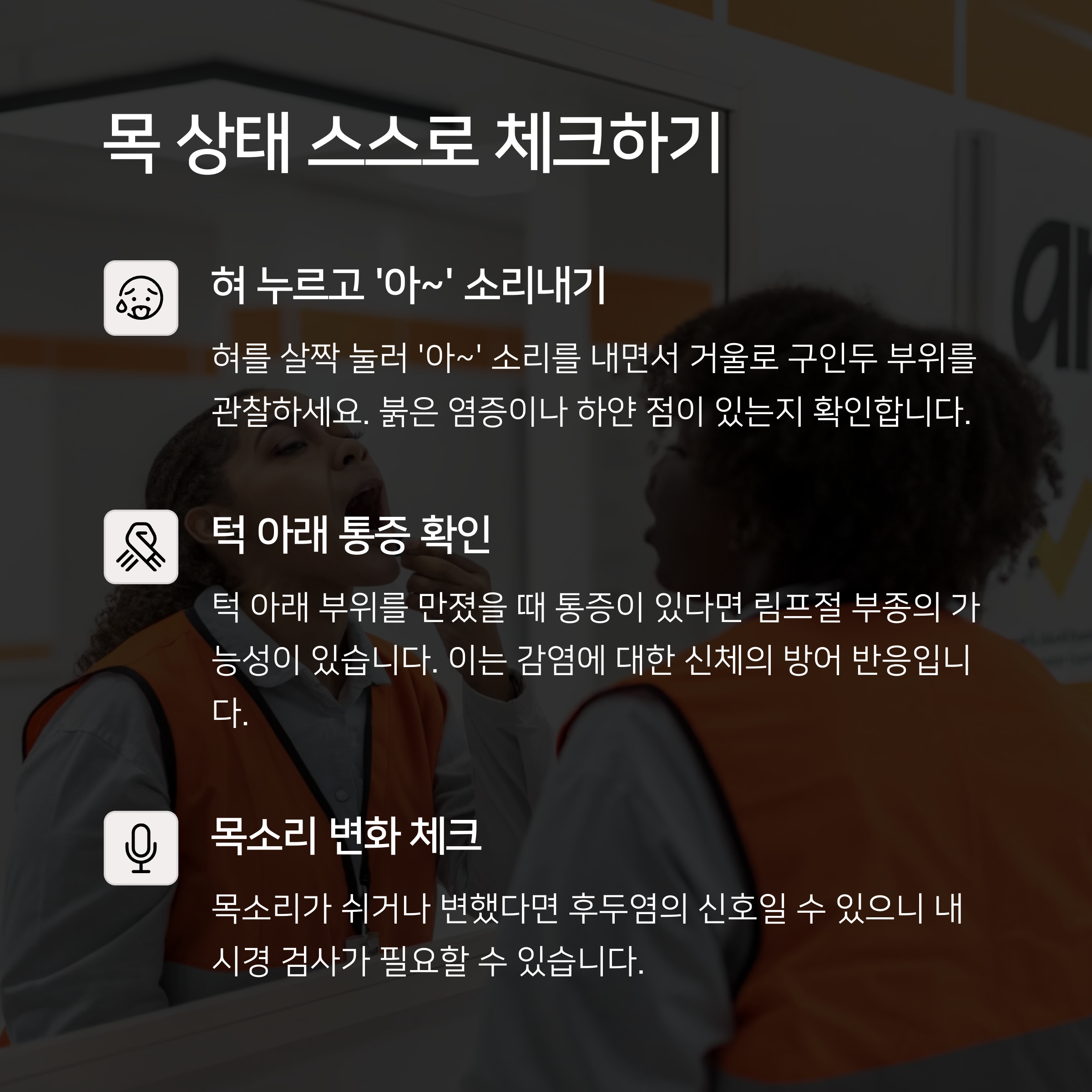 “목이 따끔한데 병원 갈 정도는 아닐까?” 싶을 때는 간단한 자가 진단으로 어느 정도 상태를 파악할 수 있습니다. 아래 기준들을 참고해보세요. 거울 앞에 앉아 혀를 눌러 '아~' 소리를 내며 목 안쪽을 관찰하는 것도 좋은 방법입니다.