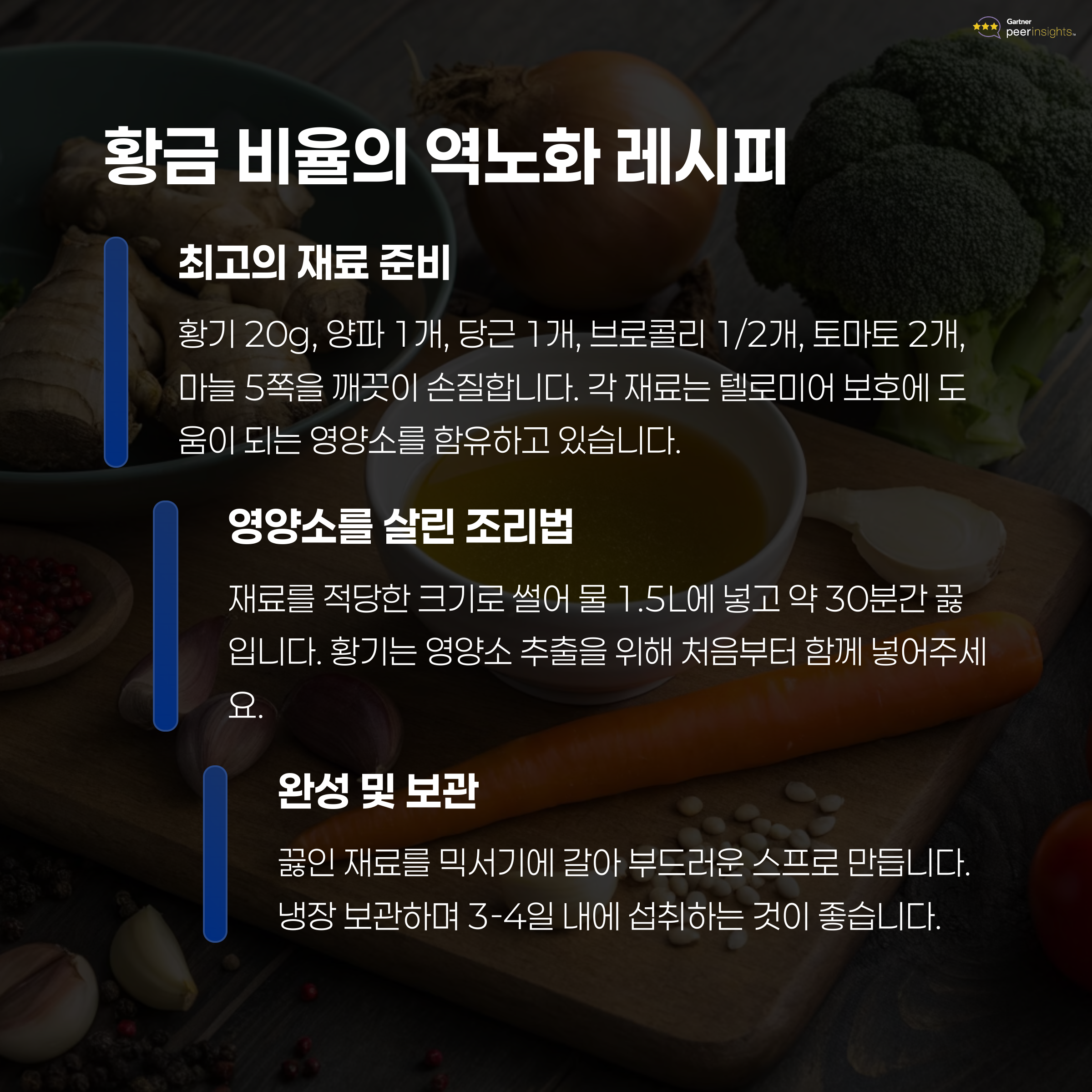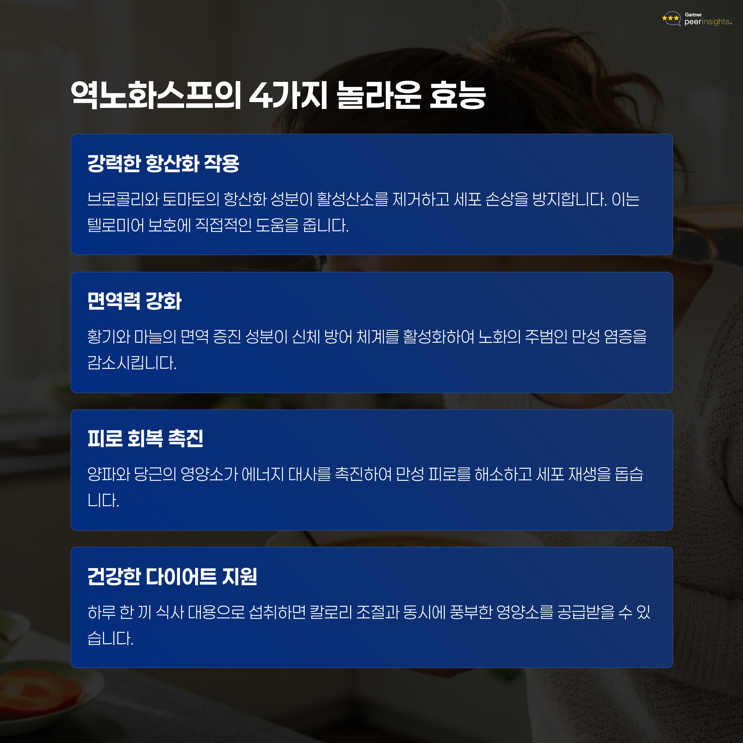 역노화스프가 주목받는 이유는 단순한 채소 스프를 넘어, 항산화 작용과 노화 지표 개선에 기여할 수 있다는 점에 있습니다. 특히 세포 내 텔로미어 길이를 지켜주는 재료들이 다량 포함되어 있어, 실제로 방송 속 부부 사례처럼 생체 나이 회복에도 긍정적인 효과를 기대할 수 있습니다.