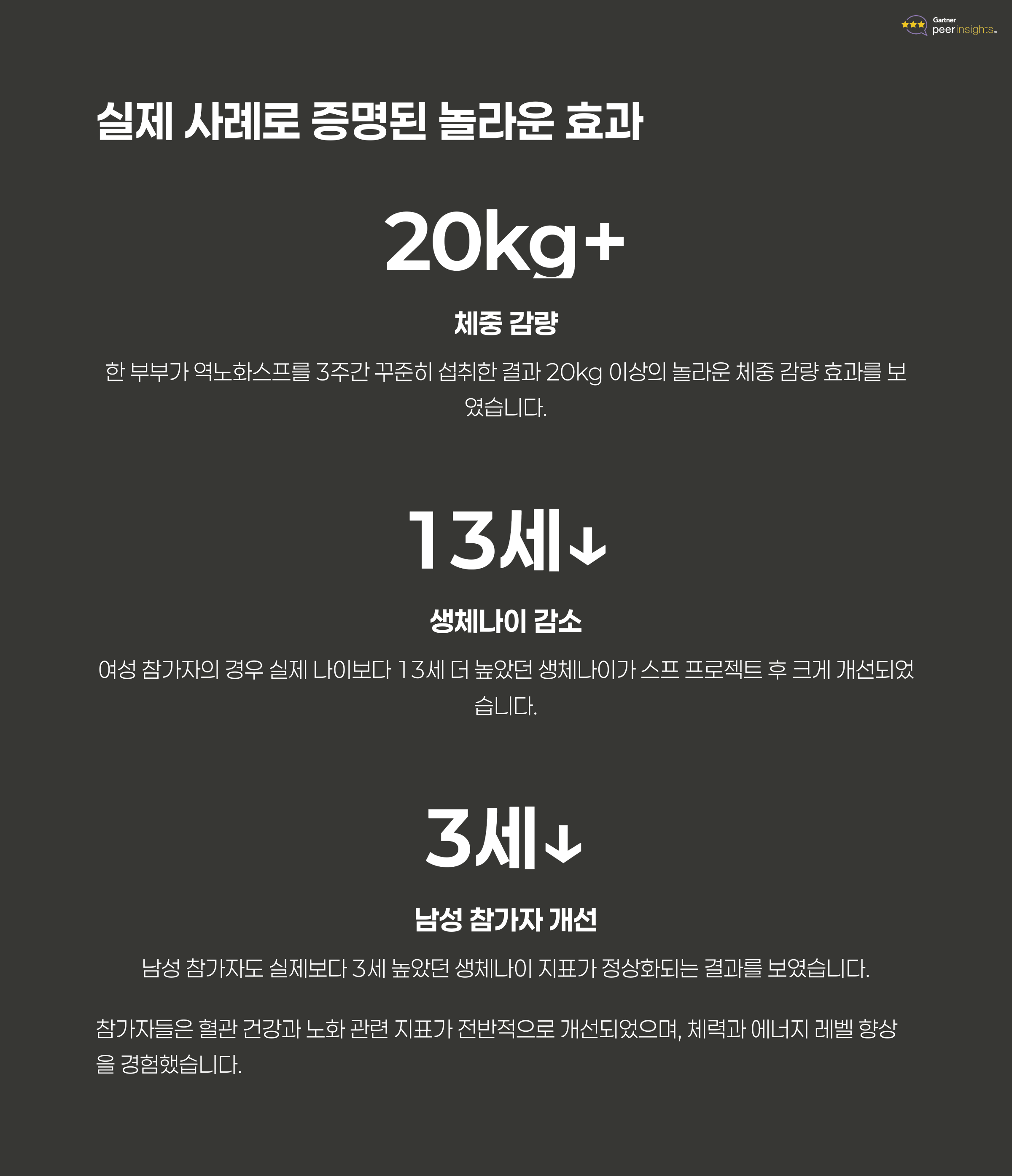 이를 개선하기 위한 식단 처방으로 등장한 것이 바로 ‘역노화스프’. 방송에 따르면 이 부부는 3주간 이 스프를 식단에 포함해 꾸준히 섭취한 결과, 생체 나이 및 혈관 나이에 뚜렷한 개선이 있었고, 피부 톤과 체력도 눈에 띄게 좋아졌다고 전했습니다.