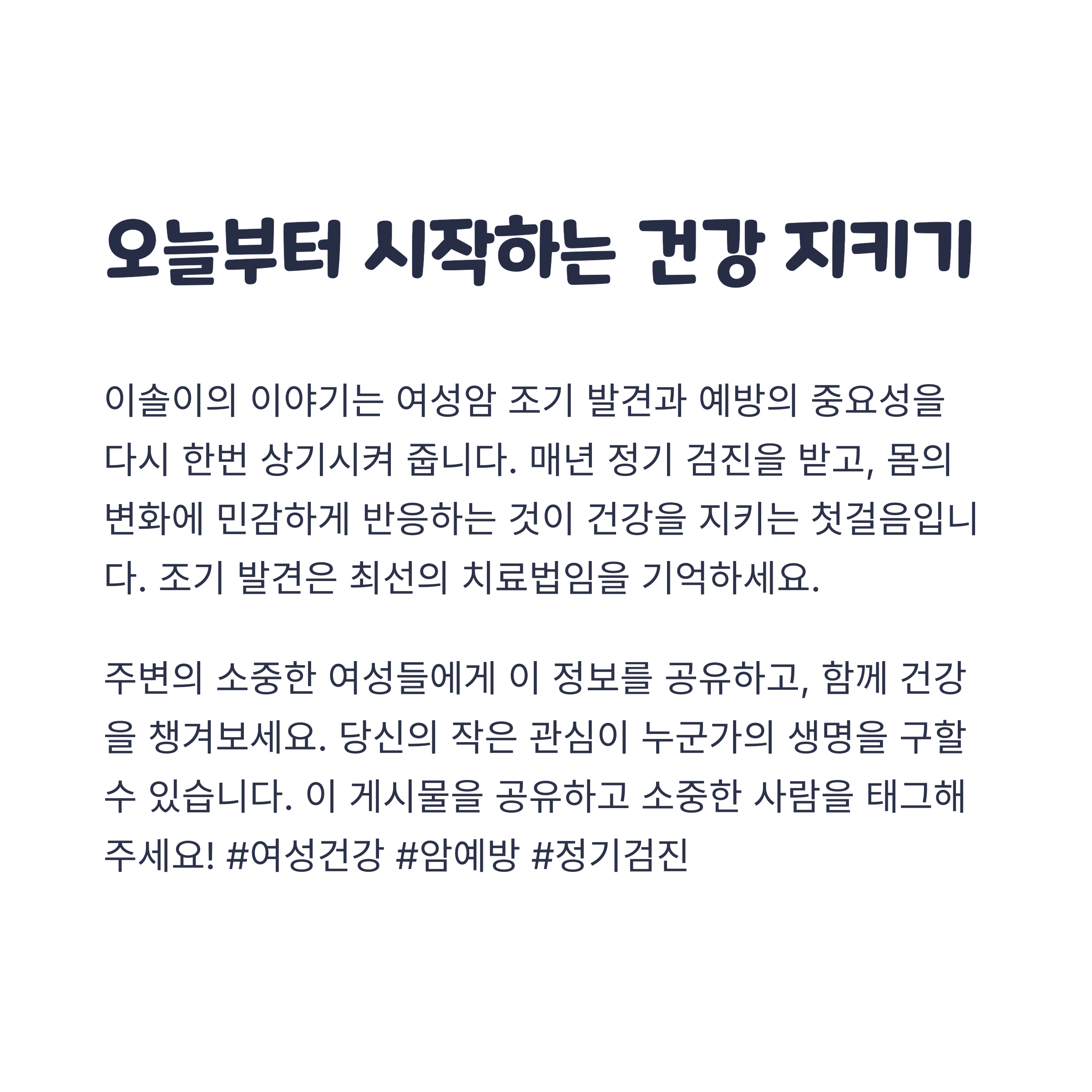 여성암 예방의 첫걸음은 자신의 몸 상태를 자주 확인하고, 정기적으로 검사를 받는 것입니다. 암은 초기에 발견할수록 생존율이 높기 때문에, 작은 신호에도 주의를 기울이는 습관이 필요합니다. 이솔이 씨의 용기 있는 공개를 통해 많은 분들이 건강을 소중히 여기고, 자신과 가족의 건강을 돌보는 계기가 되길 바랍니다.