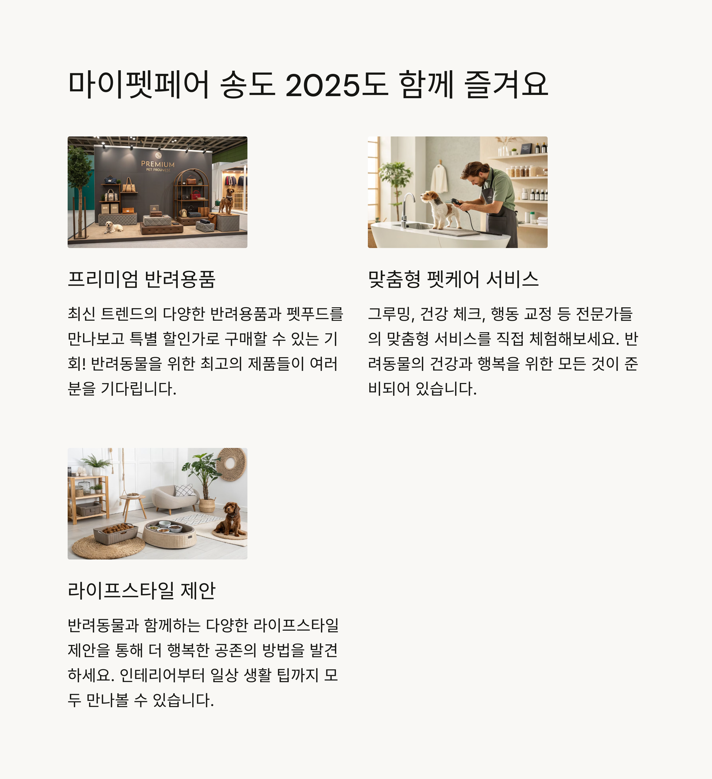 같은 기간, 같은 장소에서 ‘마이펫페어 송도 2025’도 함께 열립니다. 이 행사는 반려동물 용품, 사료, 미용, 훈련, 건강관리 등 펫 산업 전반을 다루는 전문 박람회로, 여행박람회와 함께 관람이 가능합니다. 반려동물과의 일상 전반을 아우르는 정보를 한자리에서 얻을 수 있는 좋은 기회가 될 거예요.