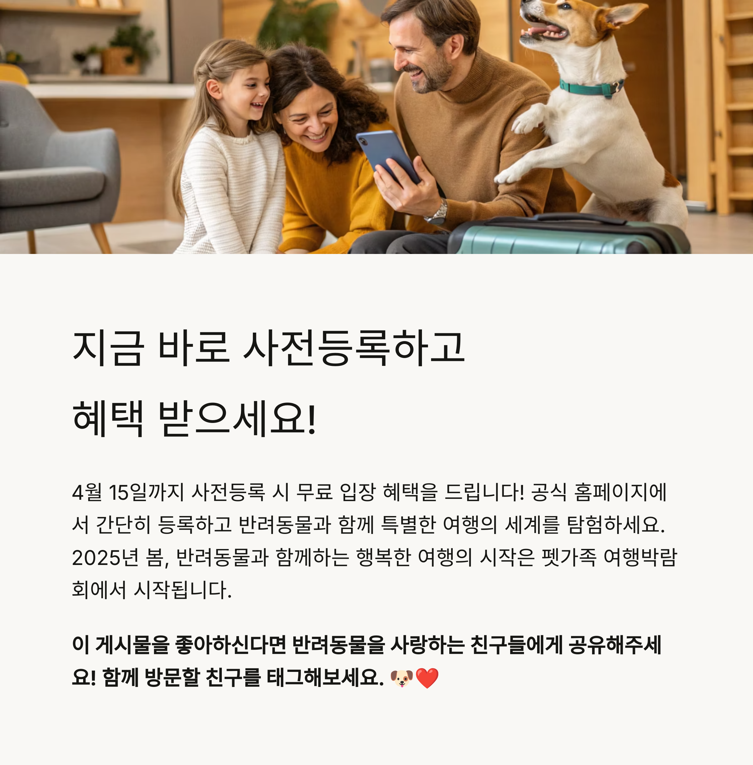 단순히 반려동물과 동행하는 여행을 넘어서, ‘가족으로 함께하는 삶의 방식’을 제안하는 펫가족 여행박람회. 이번 송도 행사는 그런 새로운 문화를 직접 체험할 수 있는 특별한 장이 될 것입니다. 막연했던 여행 계획도, 이곳에 오면 조금 더 구체적이고 풍성하게 그려질 거예요. 함께 떠날 준비 되셨나요? 당신의 펫과 함께하는 다음 여행이 조금 더 특별해지길 바라며.