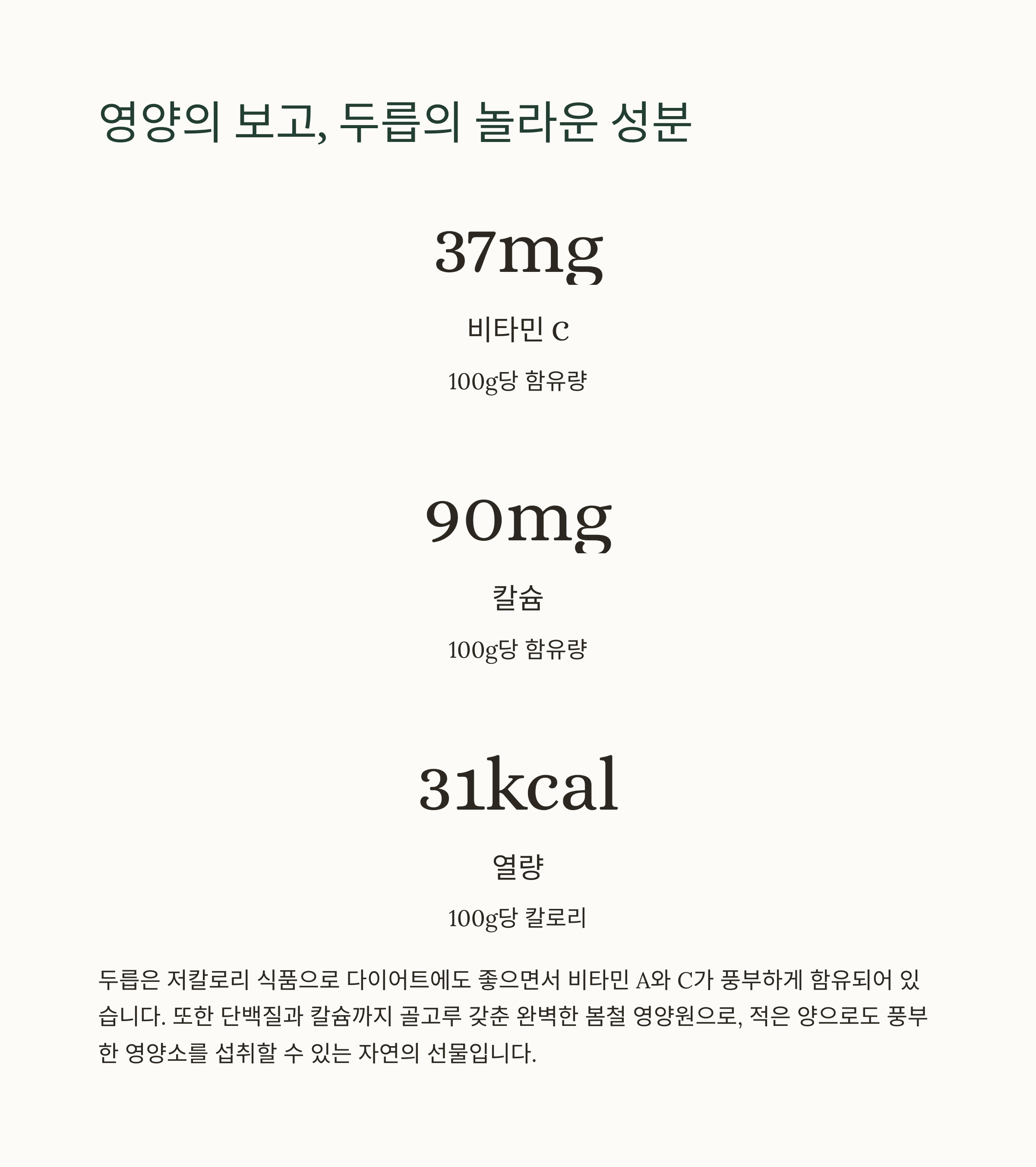 두릅은 봄의 기운을 가장 직접적으로 느낄 수 있는 자연의 식재료입니다. 손쉽게 접할 수 있는 만큼, 제철일 때 놓치지 않고 즐겨보시기 바랍니다.