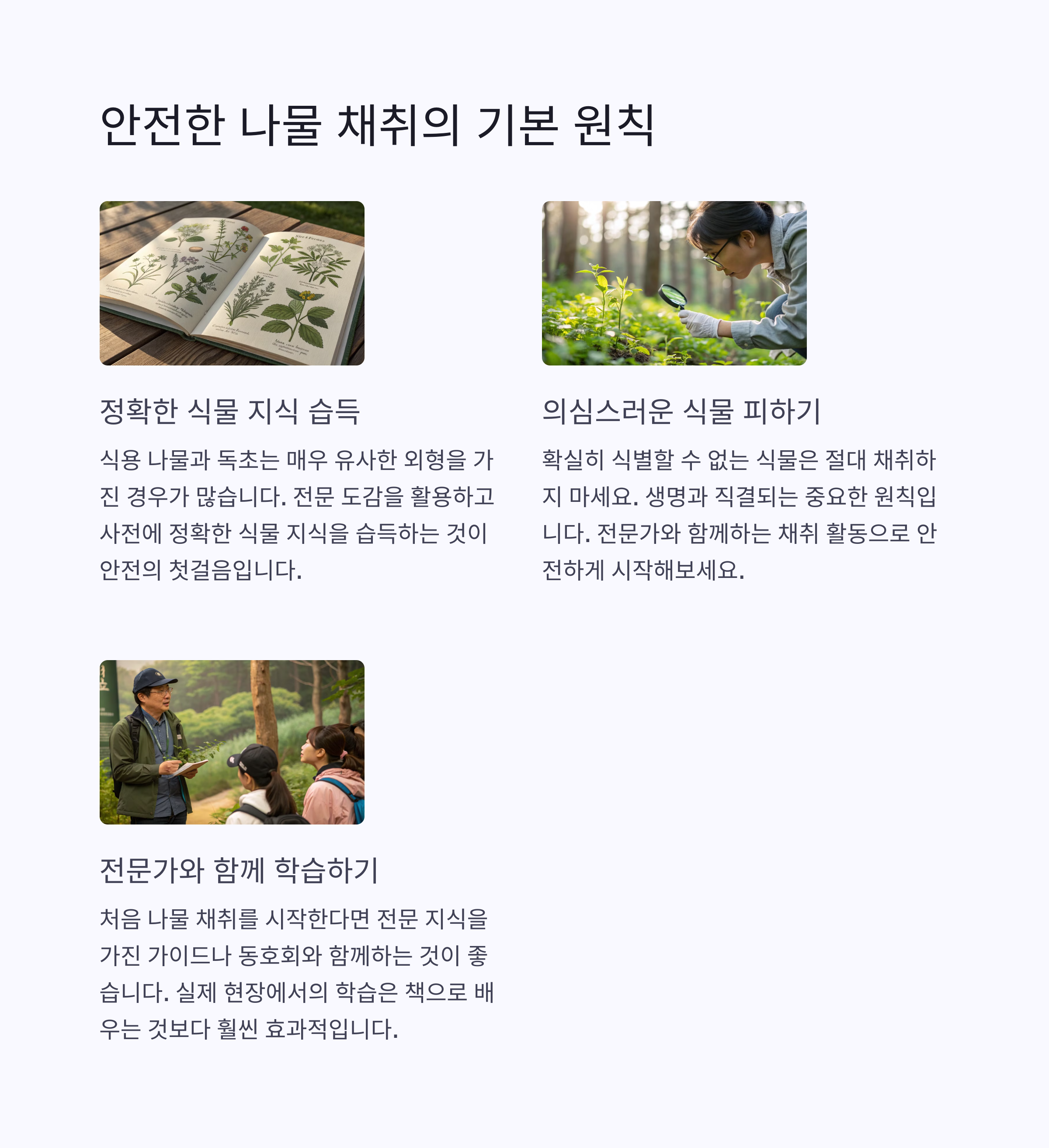 봄나물을 직접 채취할 때는 자연 상태의 다양한 식물을 접하게 됩니다. 나물과 비슷해 보이지만 독성이 있는 식물도 많으므로 식용 여부를 확실히 구분해야 합니다. 특히 개두릅, 독초, 알레르기 유발 식물 등은 유사해 보이므로 주의가 필요합니다. 모르는 식물은 절대 채취하지 않는 것이 안전합니다.