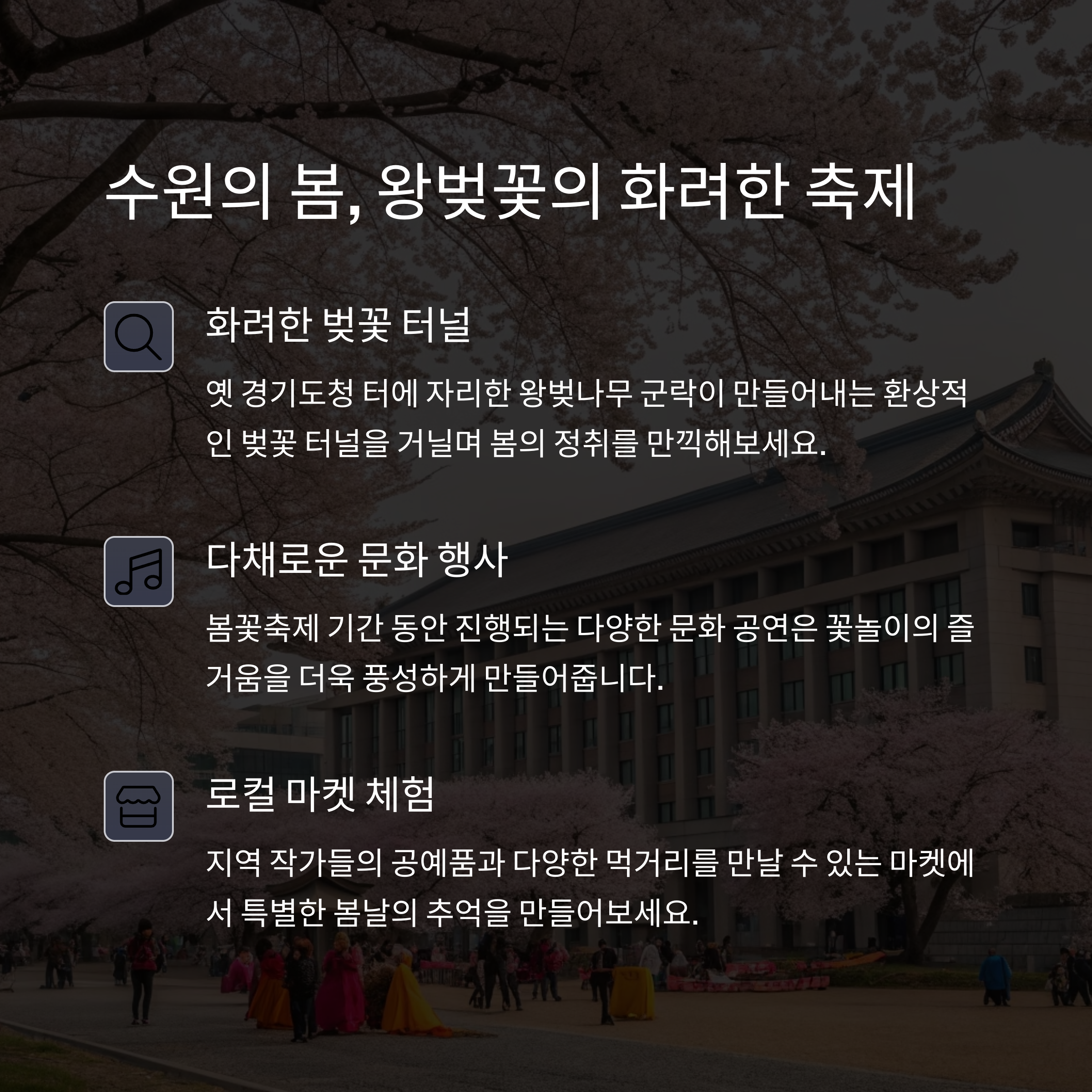 | 수원 봄꽃축제 | 왕벚나무 군락과 다채로운 문화 공연 즐기기 |