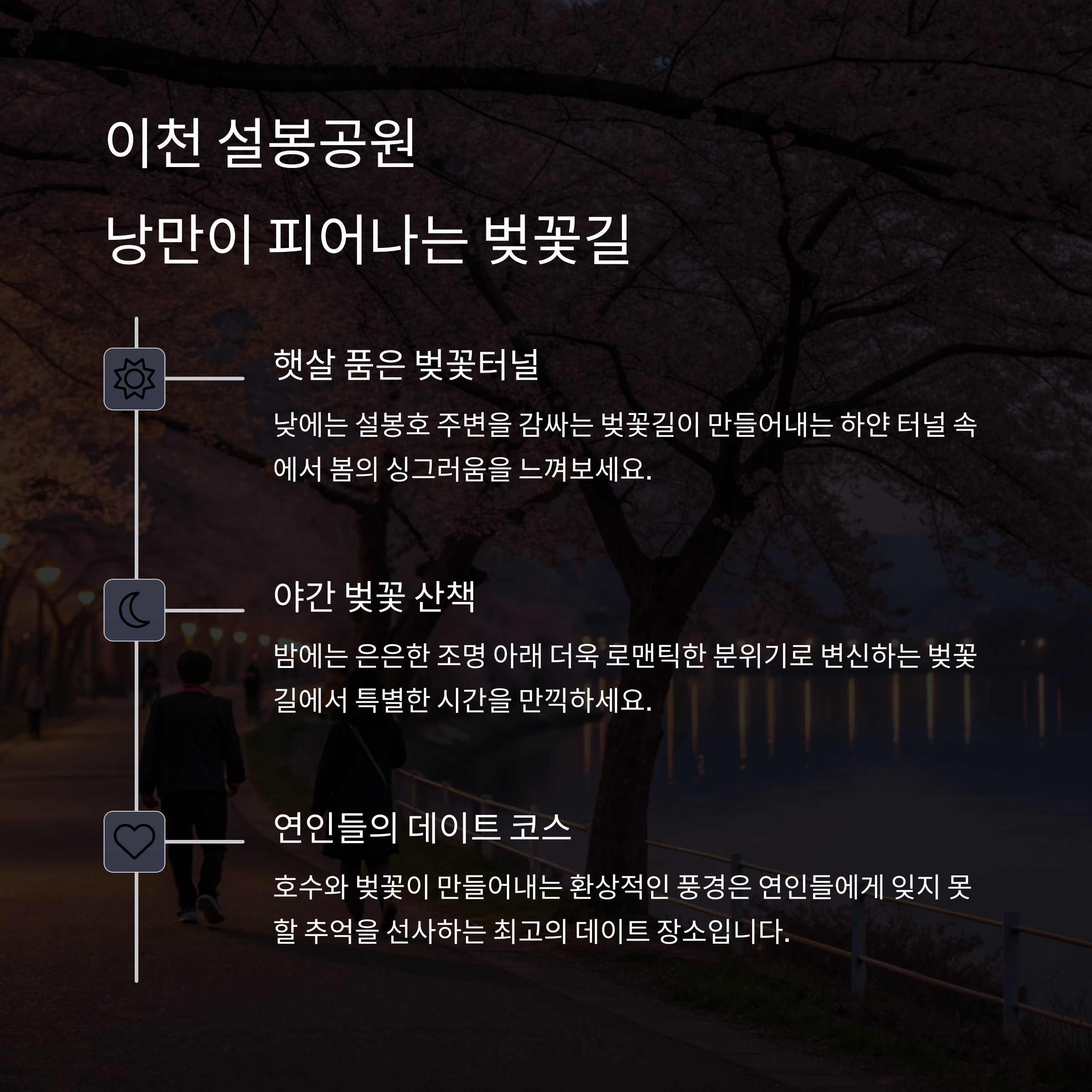 또한 이천 설봉공원은 벚꽃길이 아름다운 호숫가 산책길로 낮과 밤 모두 매력적인 풍경을 제공합니다.