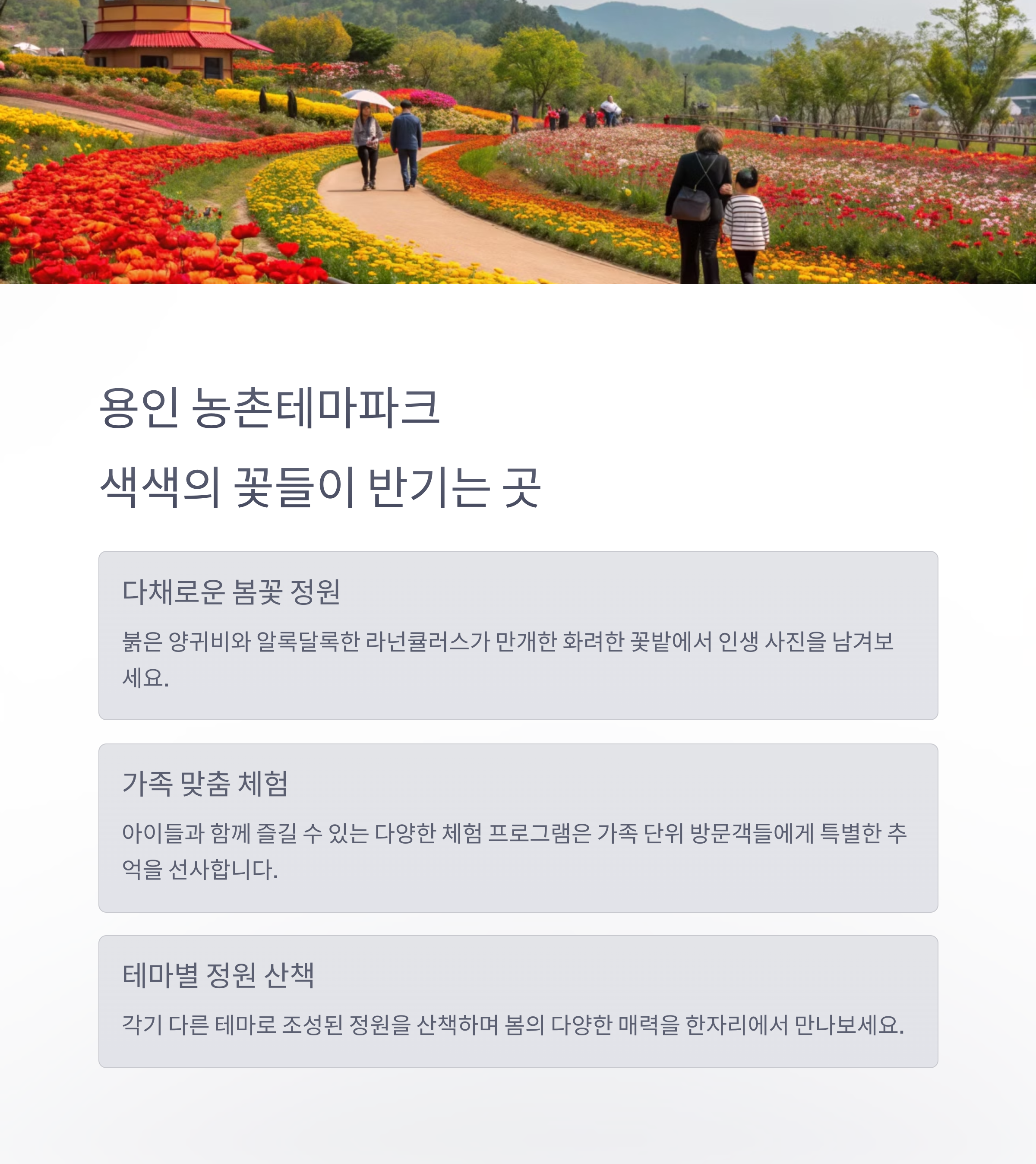 용인 농촌테마파크에서는 꽃양귀비와 라넌큘러스 등 다양한 봄꽃을 감상할 수 있는 정원이 조성되어 있으며 가족 단위 방문객들에게 인기가 많습니다.