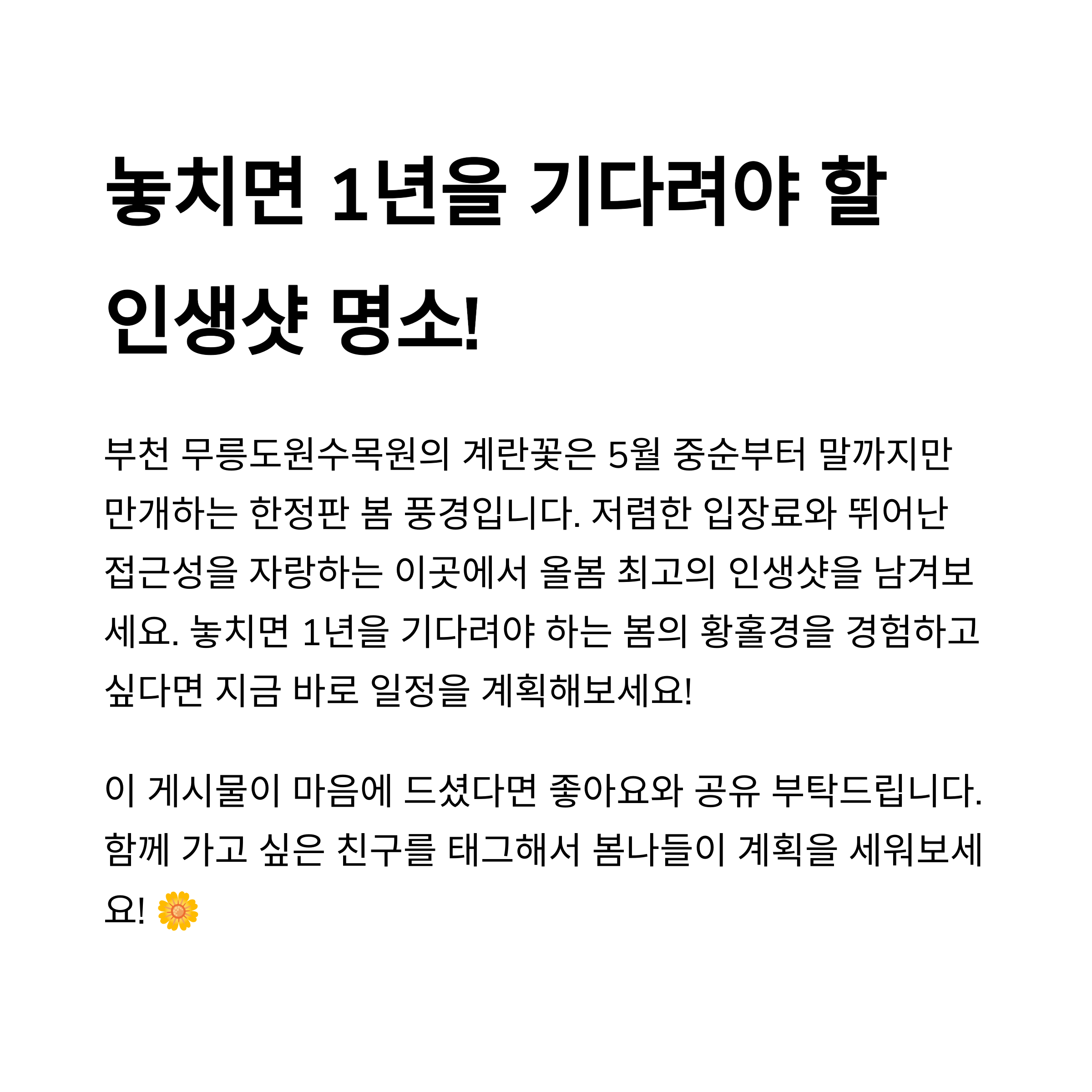 안녕하세요! 봄날의 햇살이 점점 따뜻해지면서 어딘가 잠깐이라도 바람 쐬러 가고 싶은 그런 계절이죠. 저도 며칠 전, 날씨가 너무 좋아서 그냥 무작정 나들이 계획을 짜봤는데요. 그렇게 찾게 된 곳이 바로 부천 무릉도원수목원이었어요. 특히 지금 이맘때쯤, 계란꽃이 절정으로 피어난다고 해서 진짜 안 갈 수가 없더라고요. 자연이 만들어낸 노란색 물결 속에서, 힐링도 하고 사진도 남기고 싶은 분이라면 꼭 체크해보세요!