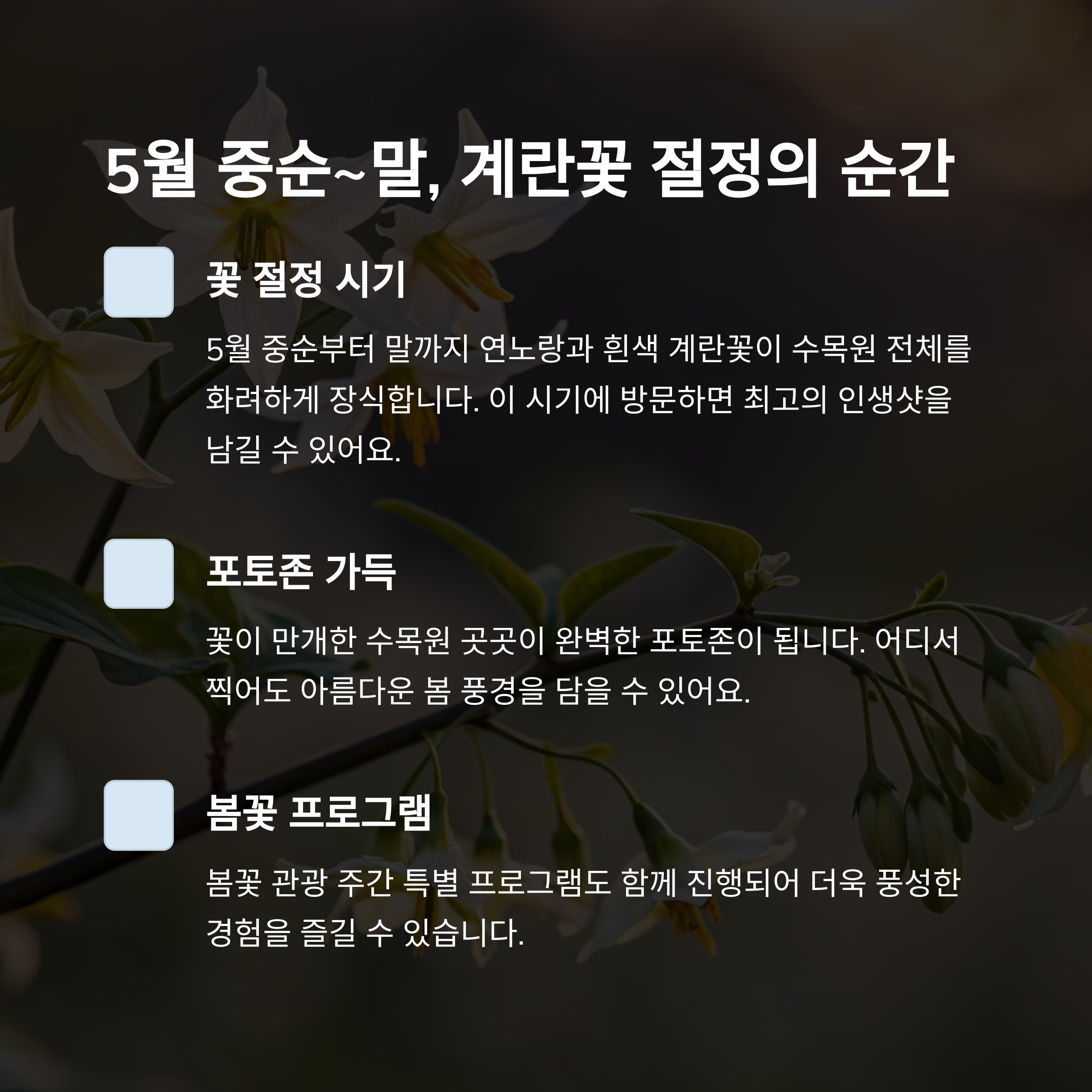 계란꽃이 활짝 핀 수목원에서 봄을 마무리하는 기분, 상상만 해도 참 기분 좋지 않나요? 저도 다음 주말에 다시 한 번 카메라 들고 출동하려고요. 꽃을 보며 힐링하고, 자연을 만끽하고, 소중한 사람들과 웃음 가득한 추억을 만드는 5월이 되셨으면 해요. 여러분도 이번 봄, 무릉도원에서 예쁜 한 장 담아보세요.