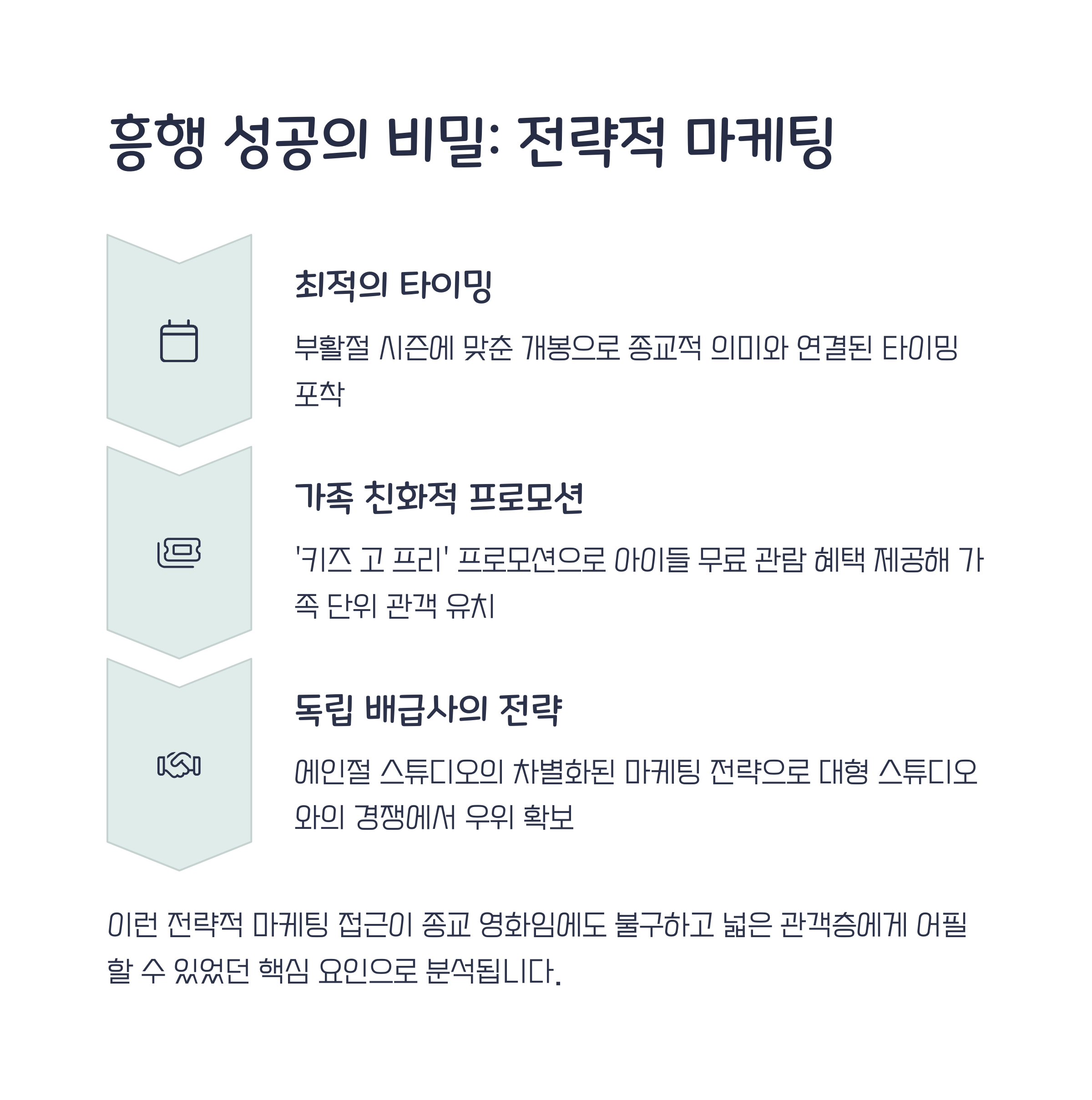 특히 종교적 감수성을 고려한 개봉 시점 선정과 가족 단위 관객을 공략한 점이 주효했죠.