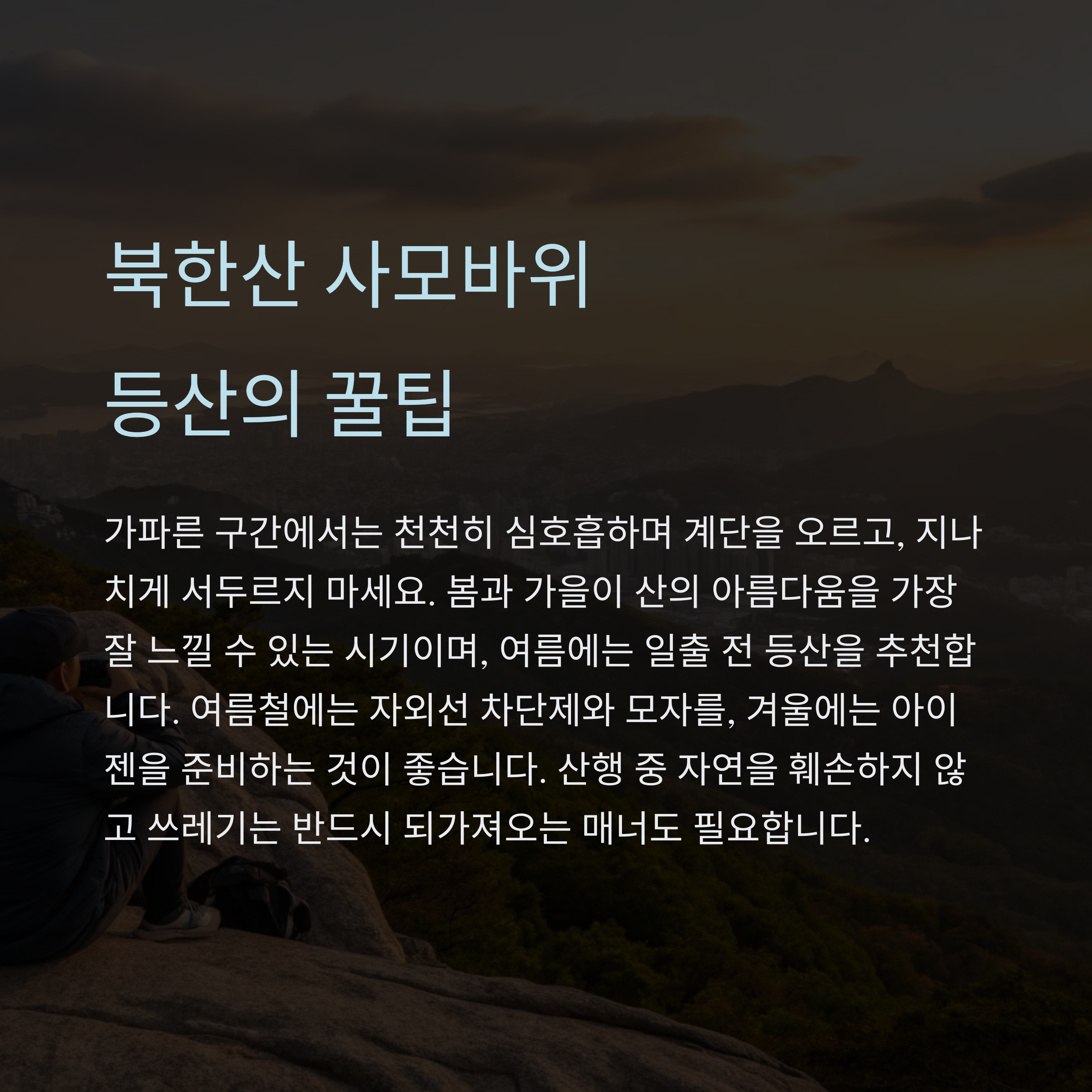 북한산 사모바위 등산 코스는 초보자도 도전할 수 있는 건강한 산행 코스로 추천합니다. 서울 도심에서 쉽게 접근할 수 있고, 사모바위 정상에서 바라보는 멋진 경치는 등산의 피로를 잊게 해줍니다. 안전하게 산행을 준비하고 가벼운 마음으로 자연을 만끽하세요!