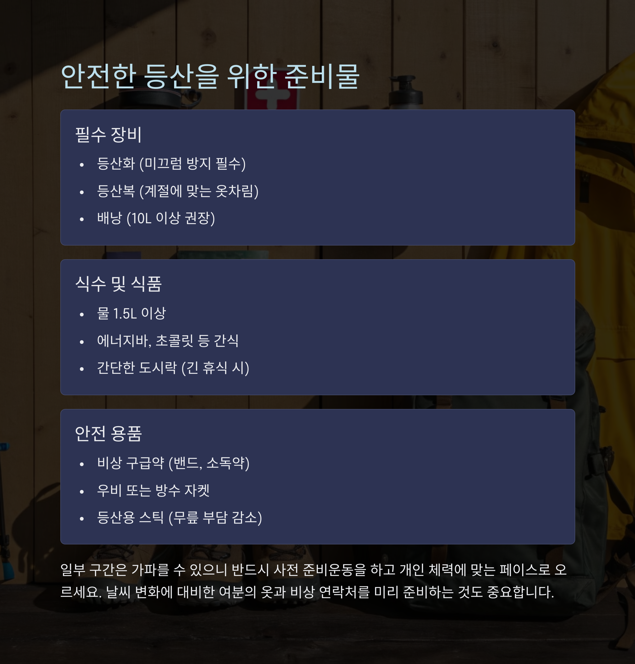 등산을 시작하기 전 충분한 준비운동이 필수입니다. 무릎과 발목 스트레칭을 통해 근육을 이완하고, 편안한 등산화를 착용하여 발목을 보호하세요. 돌계단이 있는 구간이 많으므로 쿠션이 좋은 신발이 적합합니다. 또한, 물과 간식을 준비하여 중간 휴식 시 에너지를 보충하세요.