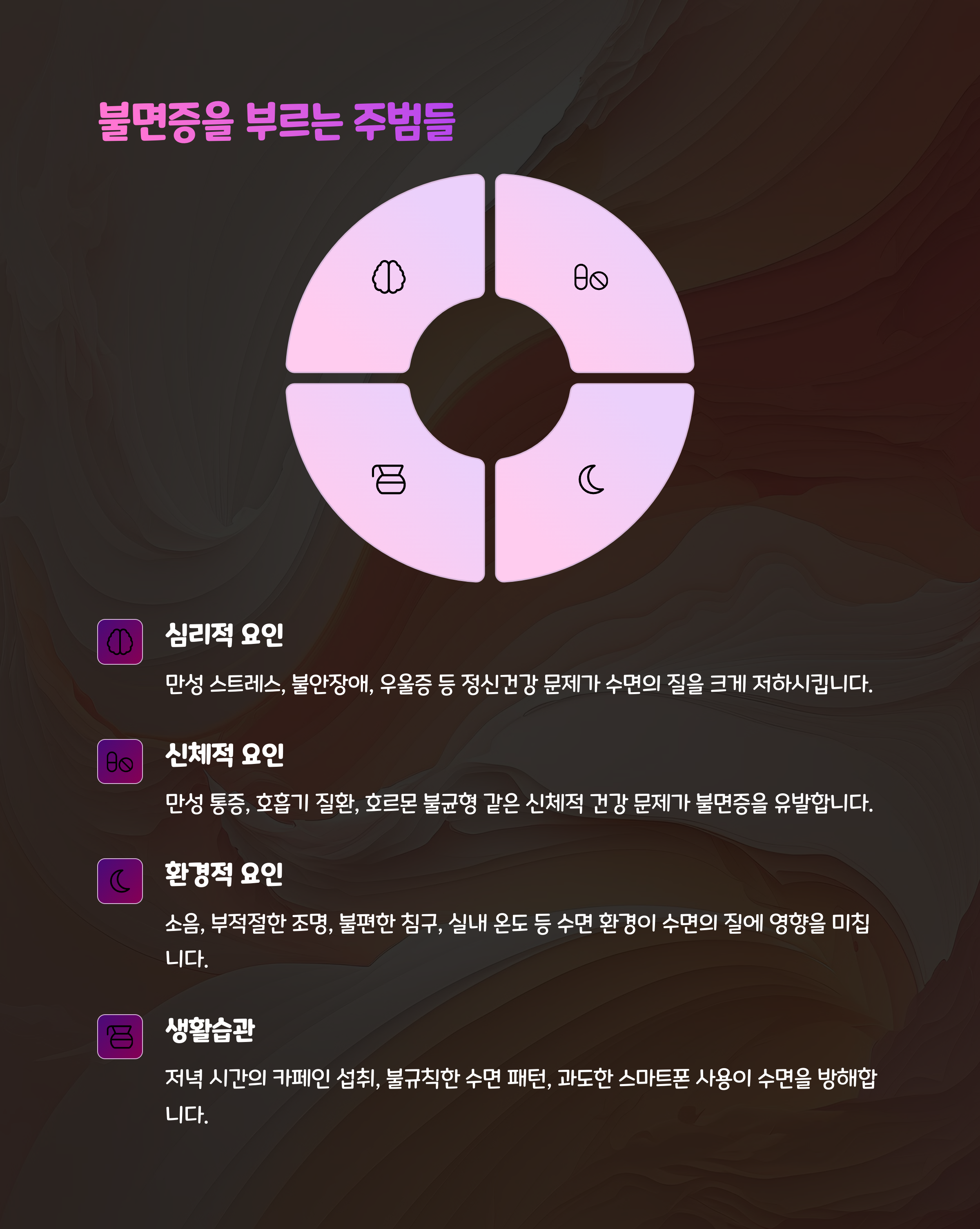 심리적 스트레스 외에도 우울증, 중년 이후 생체리듬 변화 등 다양한 원인이 있어요. 단순히 정신적 이유로만 치부하면 해결이 어려워요.