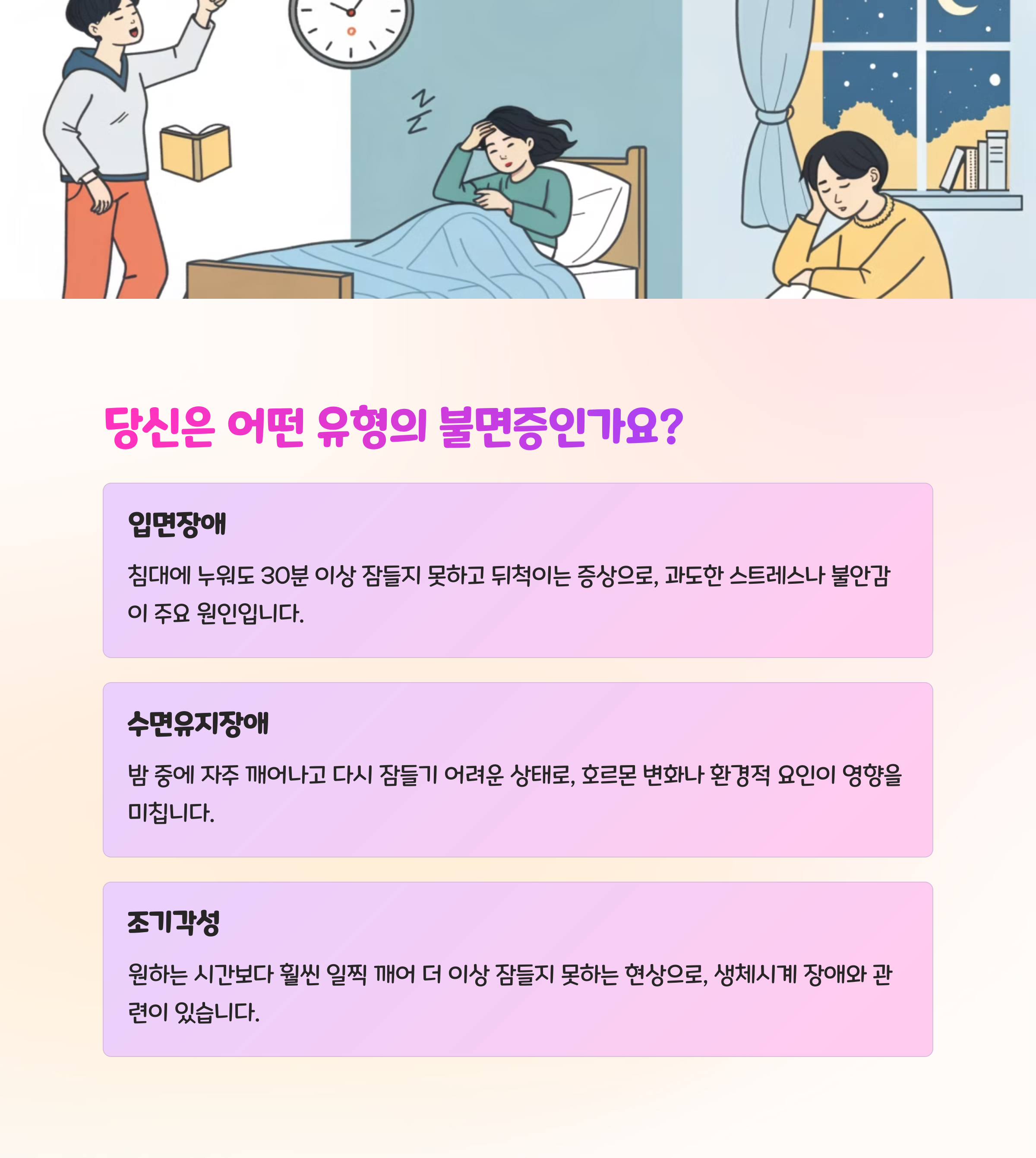 안녕하세요! 혹시 오늘도 뒤척이다가 이 글을 보고 계신가요? 저도 한동안 밤에 누워도 생각만 많아지고, 새벽에 깨서는 다시 잠들지 못했던 시기가 있었어요. 그때 알게 된 사실 하나! 불면증은 하나의 병이 아니라 다양한 유형과 원인이 있다는 거예요. 누군가는 잠드는 게 힘들고, 또 누군가는 자꾸 깨거나 새벽에 일찍 일어나죠. 오늘은 그런 다양한 불면증 유형과 원인을 분석해서 ‘내 수면 상태는 어떤 유형인지’ 함께 알아보는 시간을 가져볼게요.