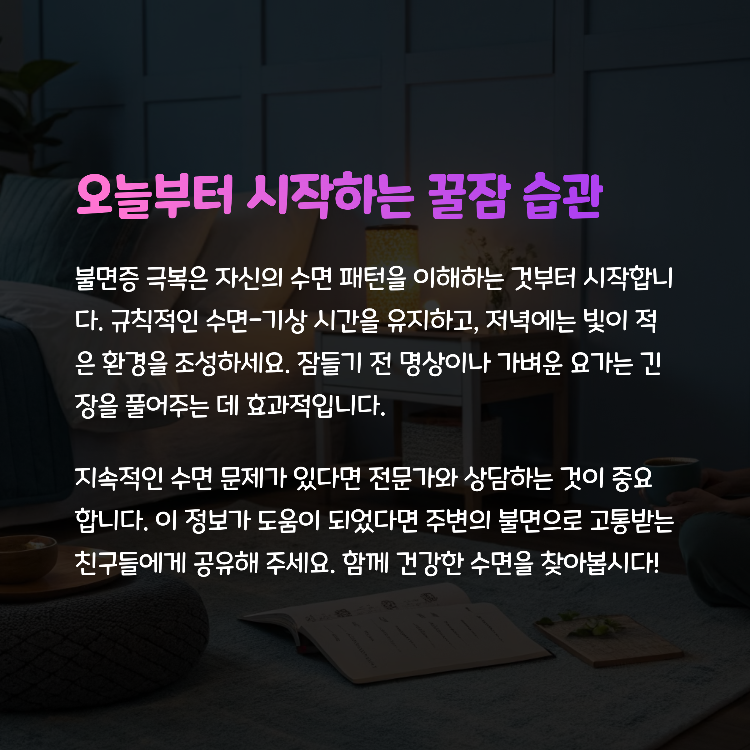 - 잠들기 전 따뜻한 물 샤워나 명상 시도