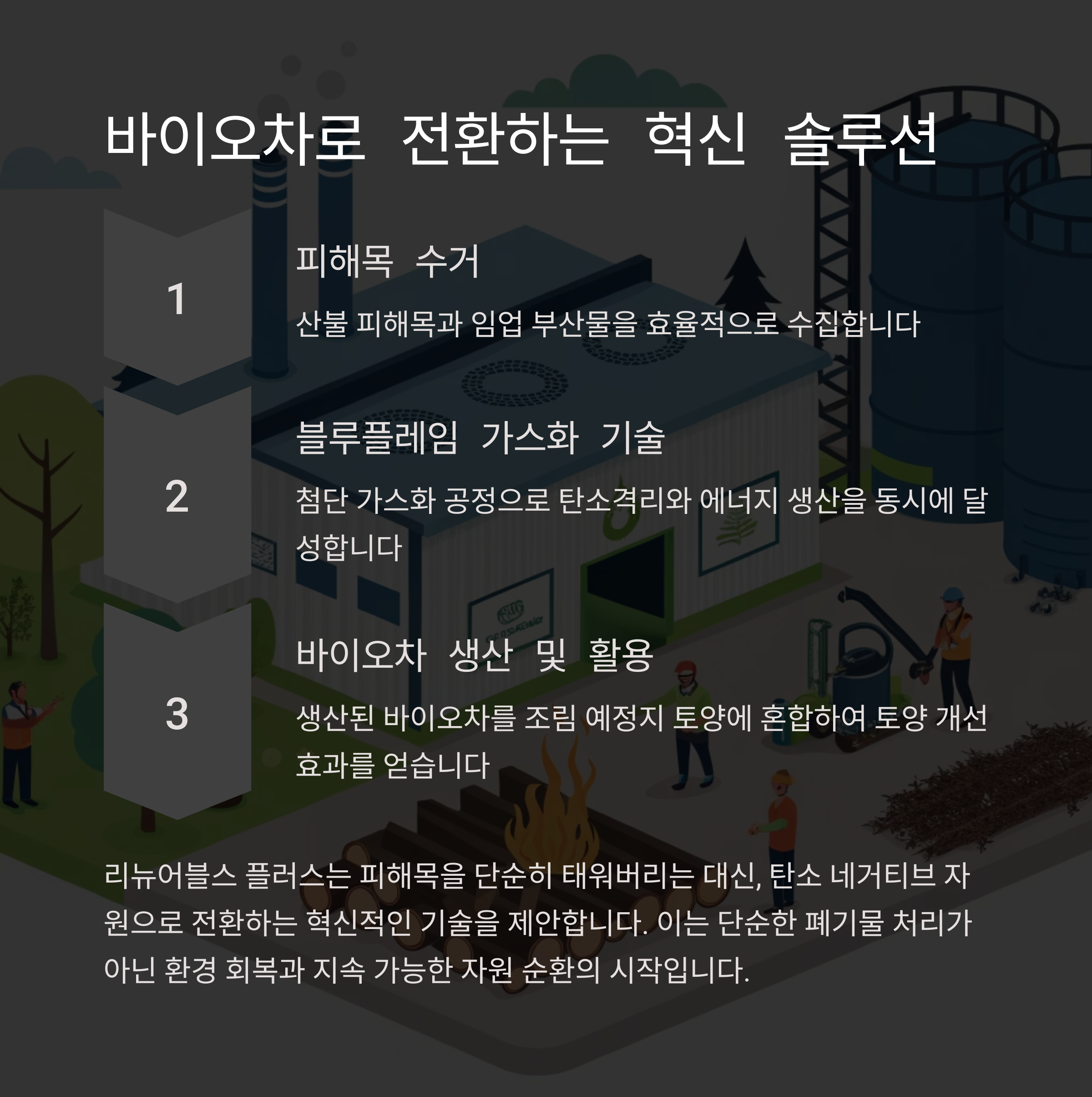 리뉴어블스 플러스는 단순히 피해목을 처리하는 대신, 이를 바이오차라는 고부가가치 탄소저감 자원으로 전환하는 모델을 제안했습니다. 특수한 가스화 공정을 통해 피해목을 처리하면서 합성가스와 바이오차를 동시에 얻고, 이 과정에서 탄소를 대기 중으로 방출하지 않고 고정시키는 방식입니다. 이 바이오차는 토양개량제, 정수처리제, 탄소저장재 등으로 활용할 수 있어, 지역 경제에도 다시 환원될 수 있는 선순환 구조를 만들어냅니다.